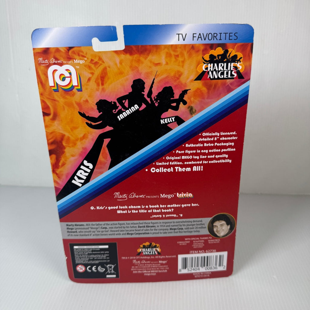 This limited edition action figure is part of the Mego TV Favorites line, numbered 3976 out of 10000, making it a rare and valuable piece for collectors. The packaging includes the Charlie's Angels logo and a trivia question related to the character, enhancing the collectible appeal. Accessories such as a small brown handbag and a black firearm are included, providing additional display options. Produced in 2018, this figure pays homage to the original Mego toy line known for its quality and attention to detail.This product is in New condition.