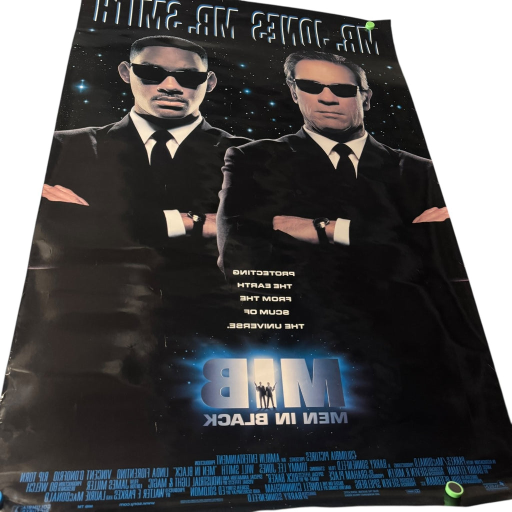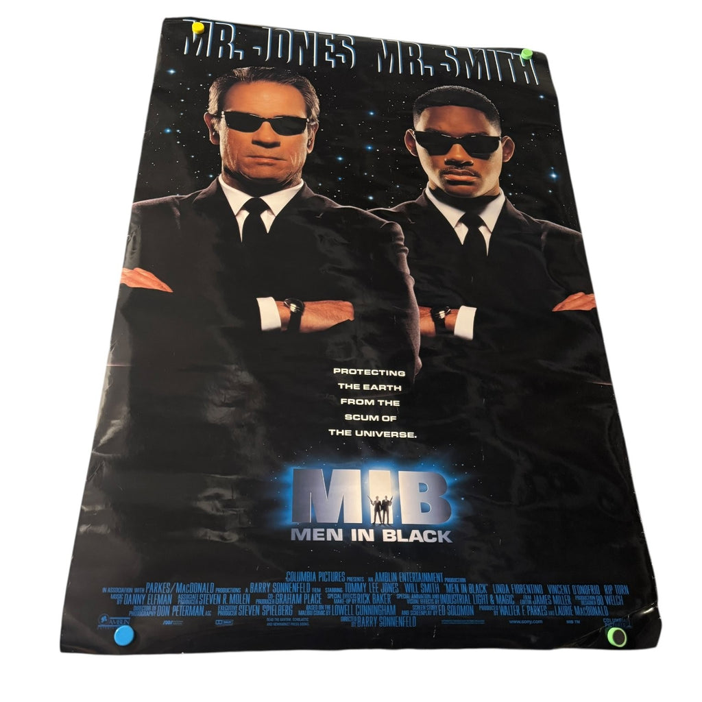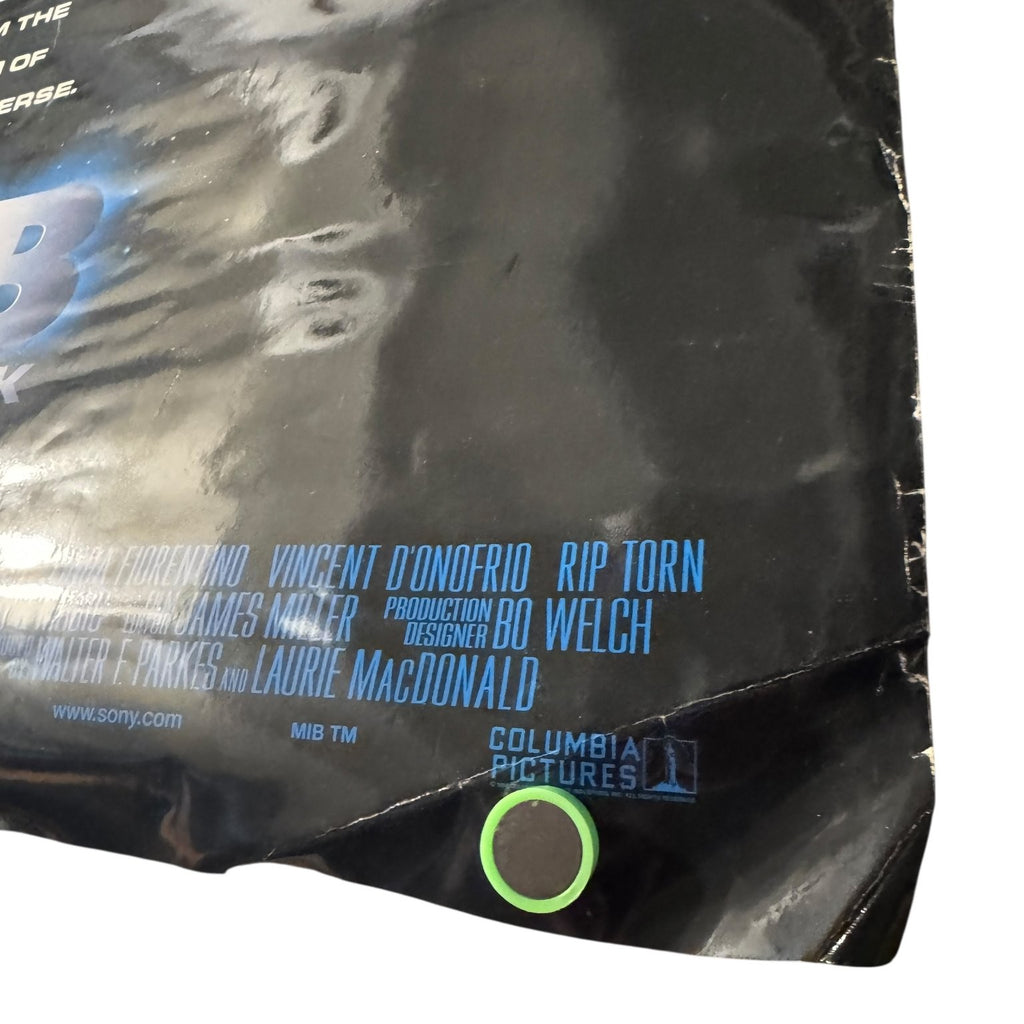 The poster is a standard US one-sheet format, measuring approximately 27.5 inches wide by 39 inches tall as shown by the visible tape measure in the images. The material appears to be traditional paper stock, printed by Columbia Pictures and Amblin Entertainment. The poster includes the logos for Columbia Pictures and Amblin at the bottom, along with copyright and film credits clearly printed. This collectible movie poster is a perfect addition for fans of the 1990s sci-fi genre, starring Tommy Lee Jones and Will Smith in their iconic roles. It is a great piece for collectors looking for authentic US cinema memorabilia from the 1990s era.This product is in Used condition.