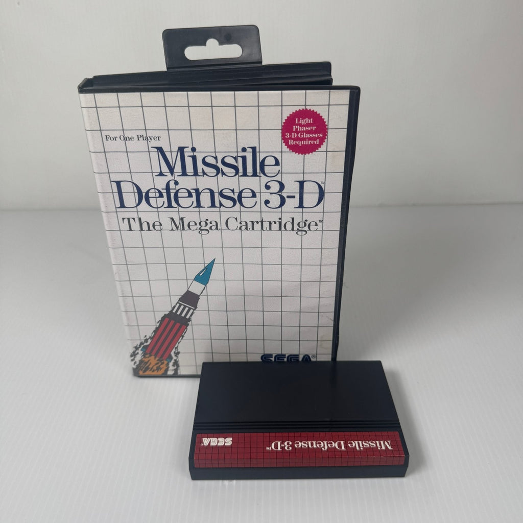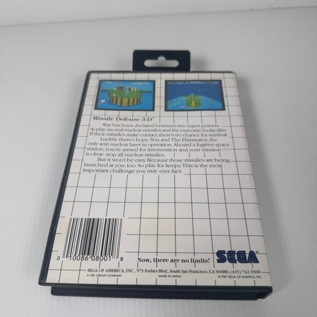 Missile Defense 3-D for the Sega Master System is a thrilling arcade-style shooter that immerses players in a high-stakes battle between two superpowers armed with nuclear missiles. Players take on the role of The Eliminator, equipped with an anti-nuclear laser aboard a rogue space station, with the critical mission to intercept and destroy incoming missiles threatening global annihilation. The game requires Light Phaser and 3-D glasses for a unique immersive experience that was groundbreaking at the time of release.