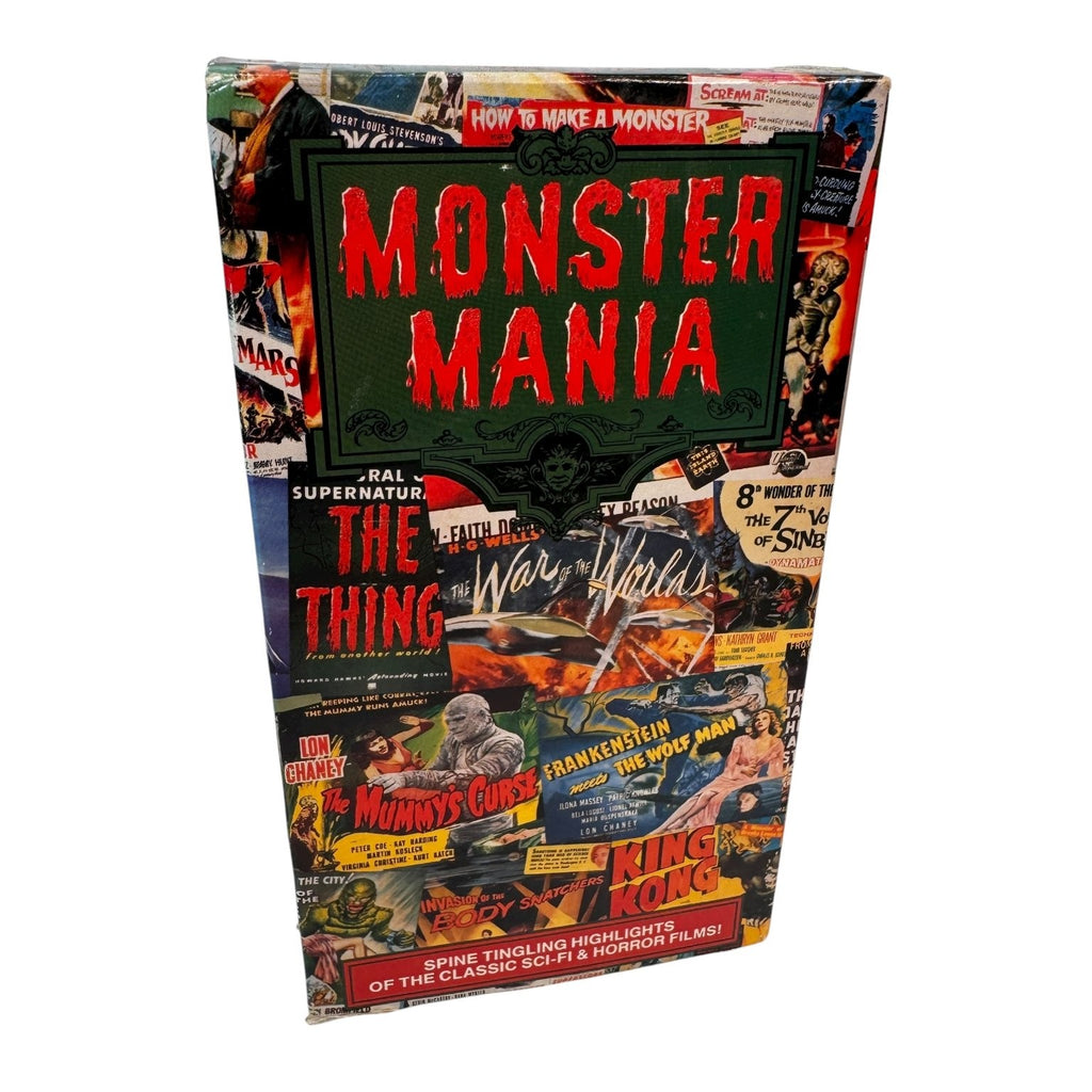Monster Mania is a thrilling 1991 VHS compilation produced by Movietime, Inc. and released by GoodTimes Home Video. This unique tape offers spine-tingling highlights of classic sci-fi and horror films, featuring iconic monsters and memorable scenes from titles such as The Thing from Another World, The War of the Worlds, The Mummy's Curse, Frankenstein Meets the Wolfman, King Kong, Night of the Living Dead, Invasion of the Body Snatchers, and more. This compilation is perfect for fans and collectors who appreciate the golden age of monster movies and classic horror cinema.