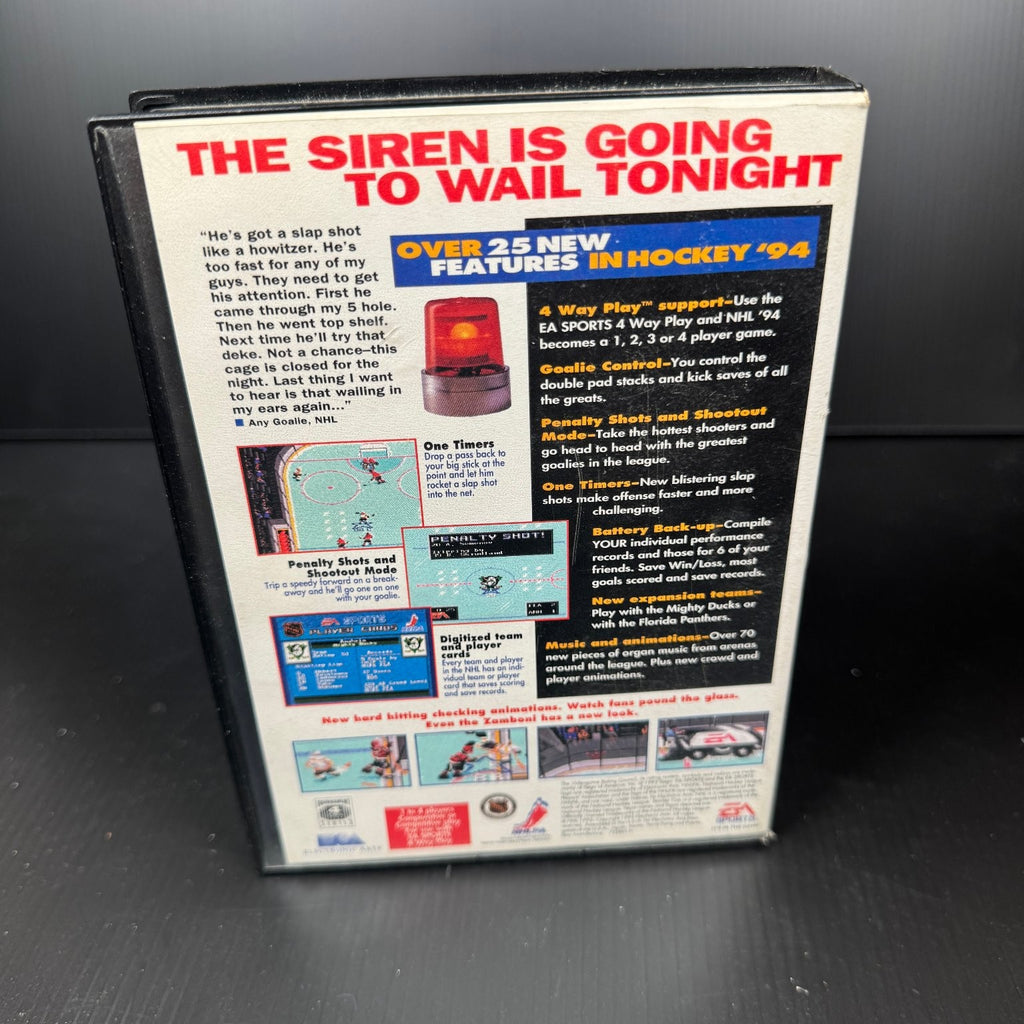 Experience the classic ice hockey action with NHL '94 for the Sega Genesis, developed by EA Sports and released in 1993. This iconic hockey simulation game brings over 25 new features including 4 Way Play support for up to 4 players, goalie control for intense defensive gameplay, and exciting penalty shots and shootout modes. Play with real NHL teams, including new expansion teams like the Mighty Ducks and Florida Panthers, and enjoy digitized team and player cards that save your scoring and records.