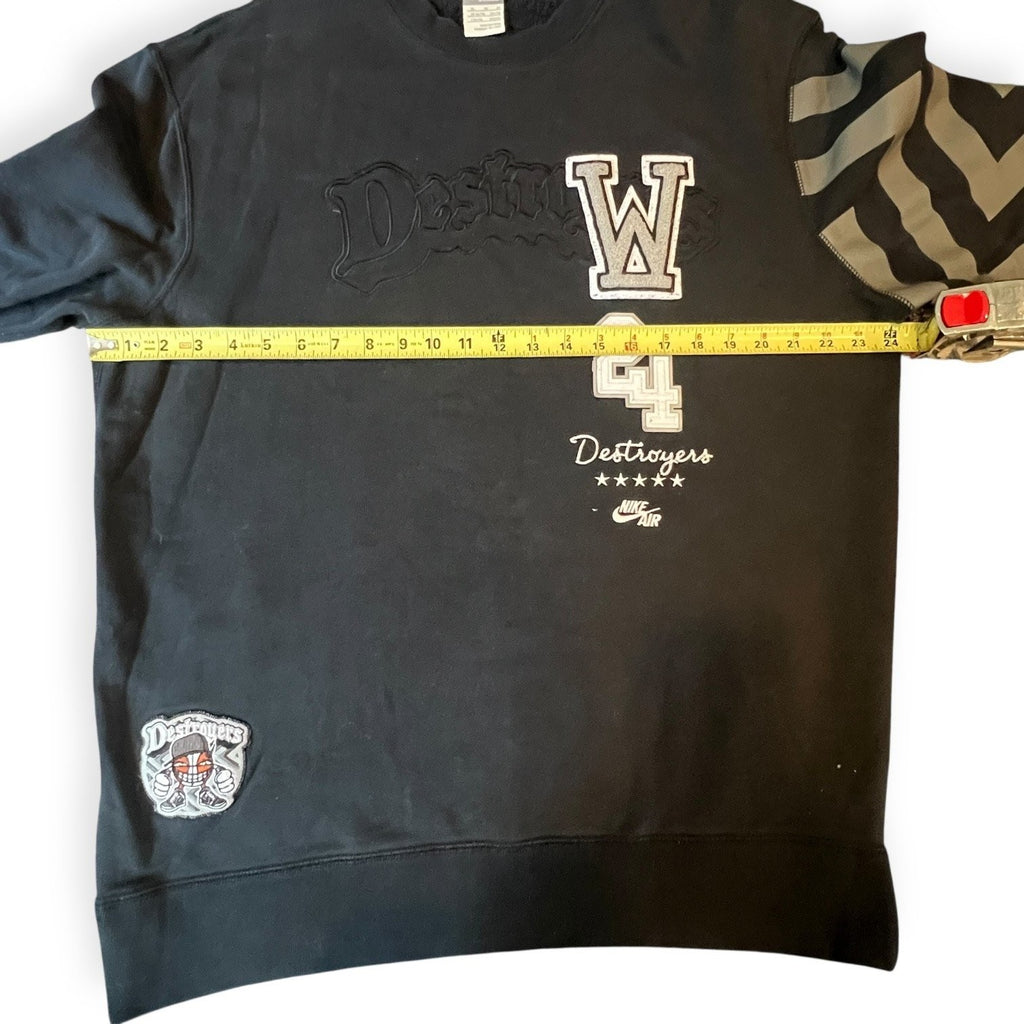 This Nike Sportswear men's sweater offers a unique athletic fit with a bold and stylish design. Featuring a classic crewneck, it is primarily black with an eye-catching chevron pattern sleeve in contrasting gray tones. The front showcases embroidered varsity-style patches including a large "W24" and "Destroyers" script with stars and the iconic Nike Air logo, adding a sporty and collegiate vibe. Additional embroidered patches on the sleeves and body enhance its distinctive streetwear appeal.