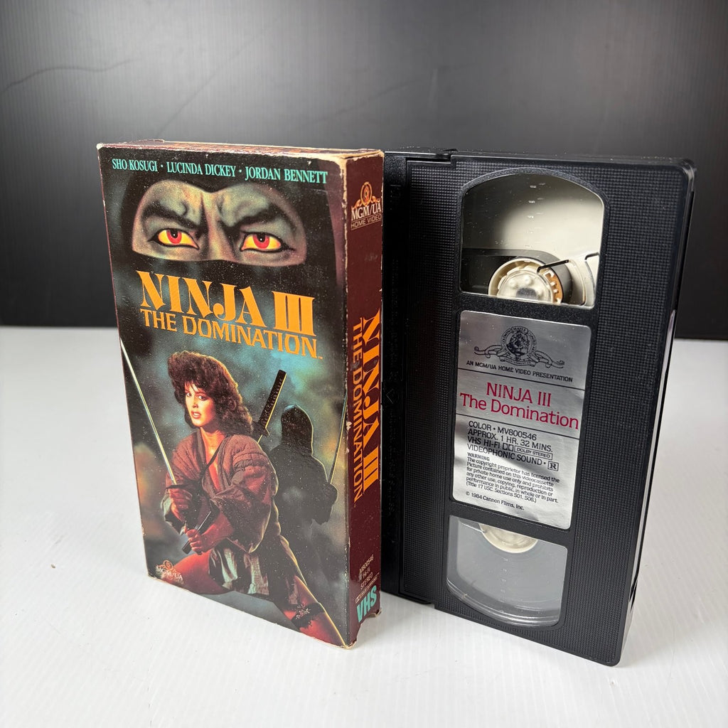 Dive into the electrifying world of martial arts and supernatural horror with "Ninja III: The Domination" on its original 1984 VHS release from MGM/UA Home Video. This cult classic stars the legendary Sho Kosugi, alongside Lucinda Dickey and Jordan Bennett, delivering a unique blend of ninja action and demonic possession that thrilled audiences. The film follows Christie, an aerobics instructor who becomes possessed by the evil spirit of a ninja assassin, leading to a thrilling battle between good and evil.