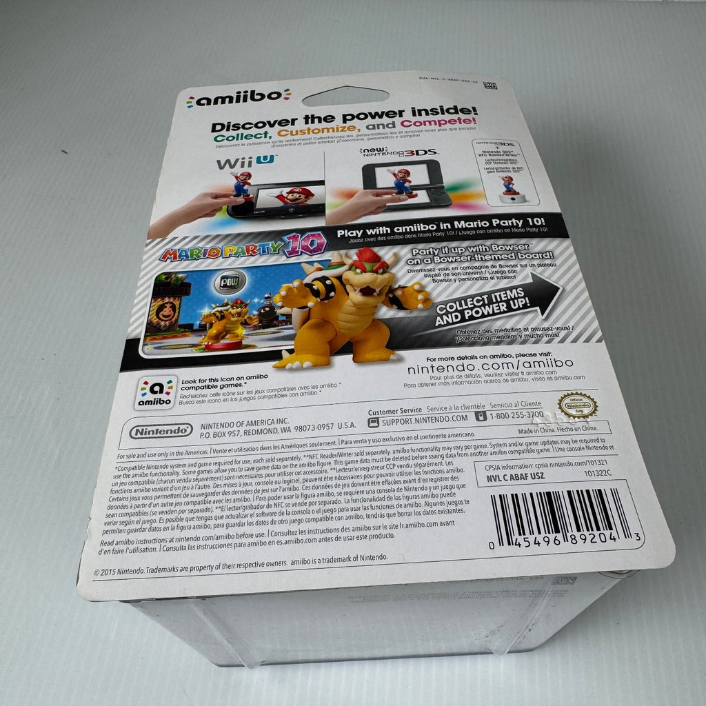 The amiibo figure features NFC technology, allowing it to interact seamlessly with Nintendo Wii U and New Nintendo 3DS platforms. Players can discover, customize, and compete in compatible games such as Mario Party 10, unlocking exclusive content and power-ups. Perfect for collectors and gamers alike, this Bowser amiibo combines functionality with the charm of a beloved Nintendo character.