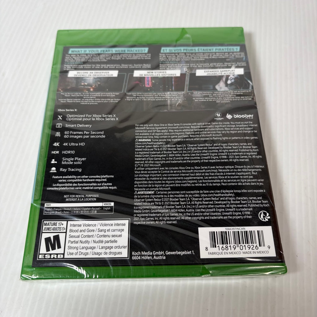Optimized for the latest generation, Observer System Redux delivers a truly next-gen experience. Enjoy stunning 4K Ultra HD visuals, HDR support, and smooth 60 Frames Per Second gameplay on Xbox Series X and Xbox One. With Smart Delivery, you'll always play the best available version for your console. Explore a world enhanced with Ray Tracing technology, bringing unparalleled realism to the neon-drenched streets and decaying interiors. This single-player title is a must-have for fans of cyberpunk, detective, and horror genres seeking a mature, intense experience.This product is in Brand New condition.