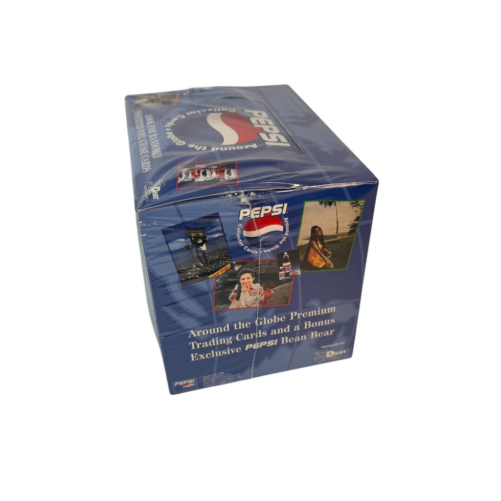This listing is for a sealed Pepsi Around the Globe Premium Trading Cards Hobby Box, produced by Dart Flipcards Inc. The box contains 36 packs, each with 6 premium trading cards. Additionally, the box includes 1 bonus Pepsi Bean Bear card. Collectors will find all 72 trading cards in the set, along with randomly inserted foil chase cards.