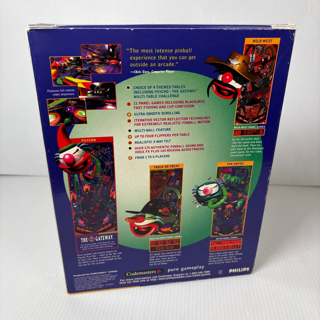Immerse yourself in the thrilling world of Psycho Pinball, a classic PC CD-ROM video game that delivers an authentic arcade experience right to your computer. This highly acclaimed pinball simulator from Codemasters and Philips features four unique themed tables: "The Gateway" (Psycho), "Wild West," "Trick or Treat," and "The Abyss." Each table offers distinct gameplay mechanics and visual flair, providing hours of engaging entertainment with multi-table challenges and a variety of interactive panel games like Blackjack, Fast Fishing, and Cup Confusion.