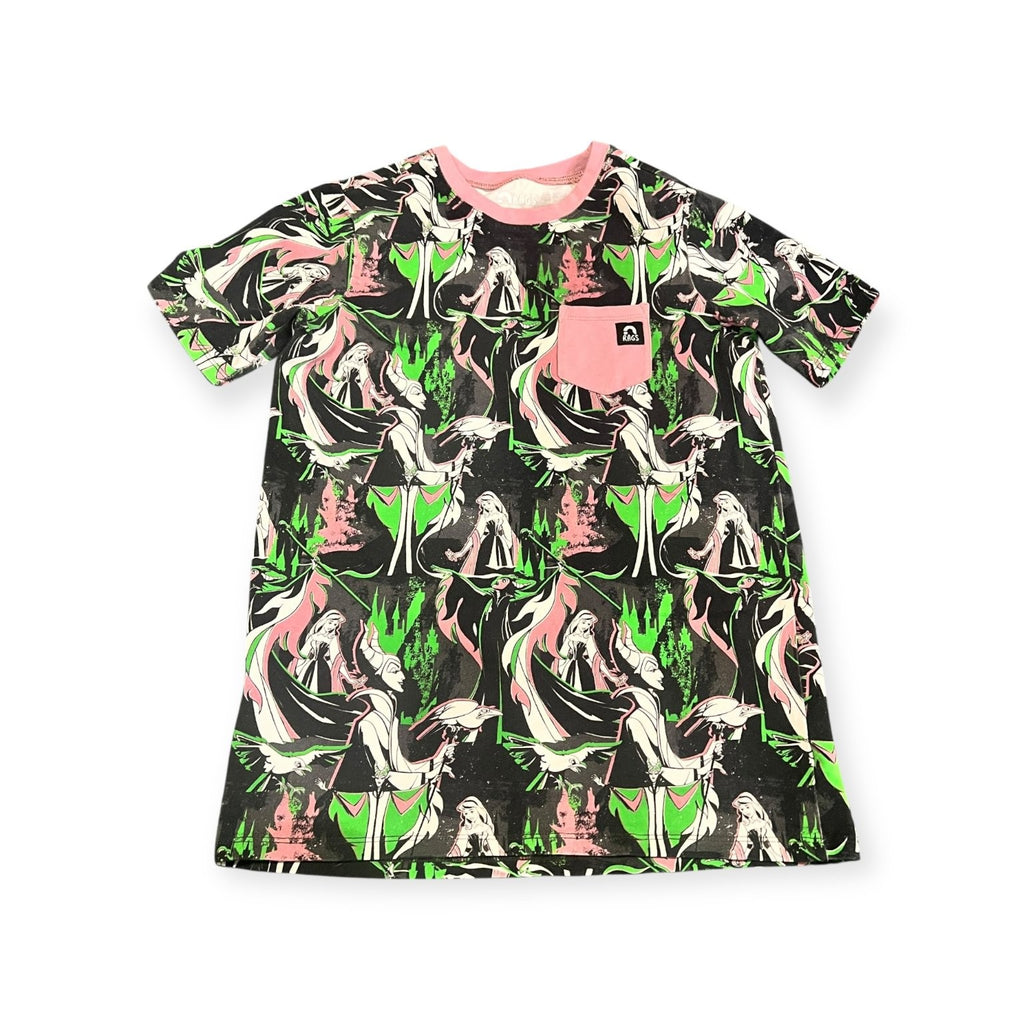 This vibrant RAGS kids' t-shirt features a bold, all-over graphic print inspired by classic fairy tale characters Aurora and Maleficent, rendered in striking shades of black, pink, and green. Designed for unisex wear, this top combines whimsical storytelling with contemporary style, making it a playful addition to any child's wardrobe. The contrasting pink crew neckline and matching chest pocket add a charming pop of color and functionality.