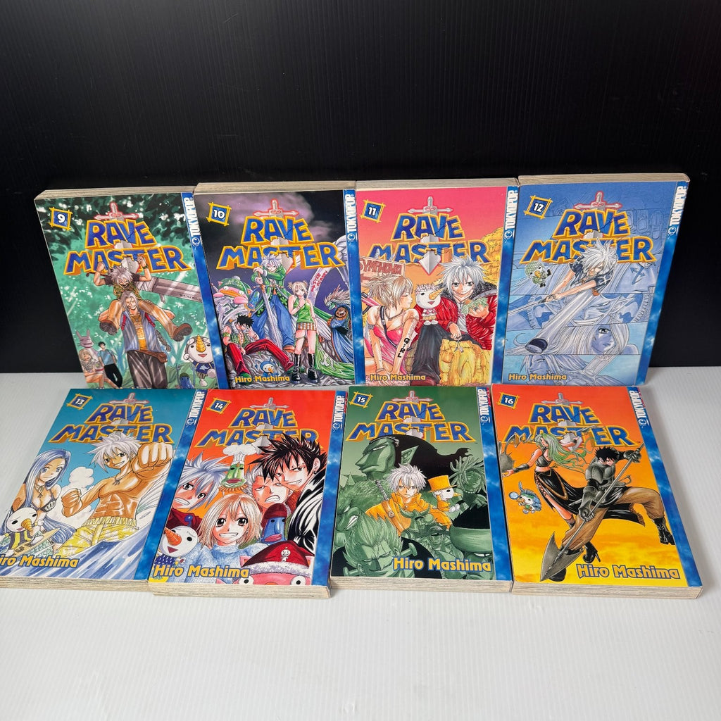 This listing features a lot of 18 manga volumes from the series Rave Master by Hiro Mashima. These volumes are published by Tokyopop and represent a modern age manga collection. The lot includes volumes 1 through 18, each with vibrant cover art showcasing key characters and scenes from the series.