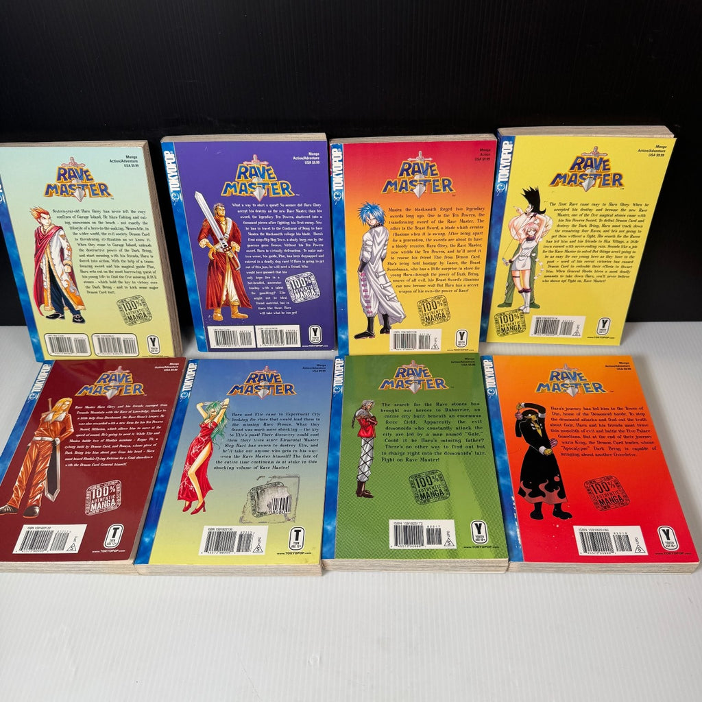 Each volume is a paperback manga edition printed in English, with cover prices visible ranging around $3.99 to $9.99. The back covers include detailed story synopses and Tokyopop branding, as well as barcode and ISBN information. This set offers a comprehensive run of Rave Master manga, perfect for collectors or fans of Hiro Mashima's work. The lot includes 18 individual manga volumes as shown.
