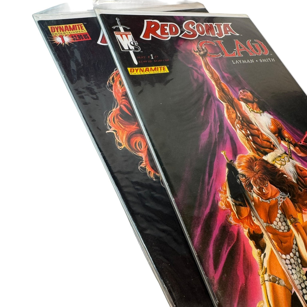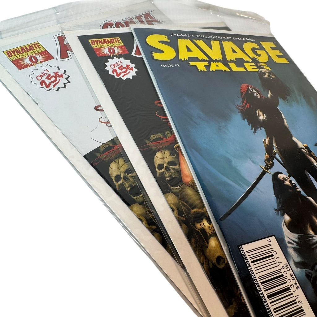 This lot features multiple single issue comic books published by Dynamite Entertainment. Included are Savage Tales Issue #1 and several Red Sonja related issues, including Red Sonja #0 (two copies with black and white covers), Red Sonja #1, and Red Sonja/Claw crossover issues #1, #2, #3, and #4.