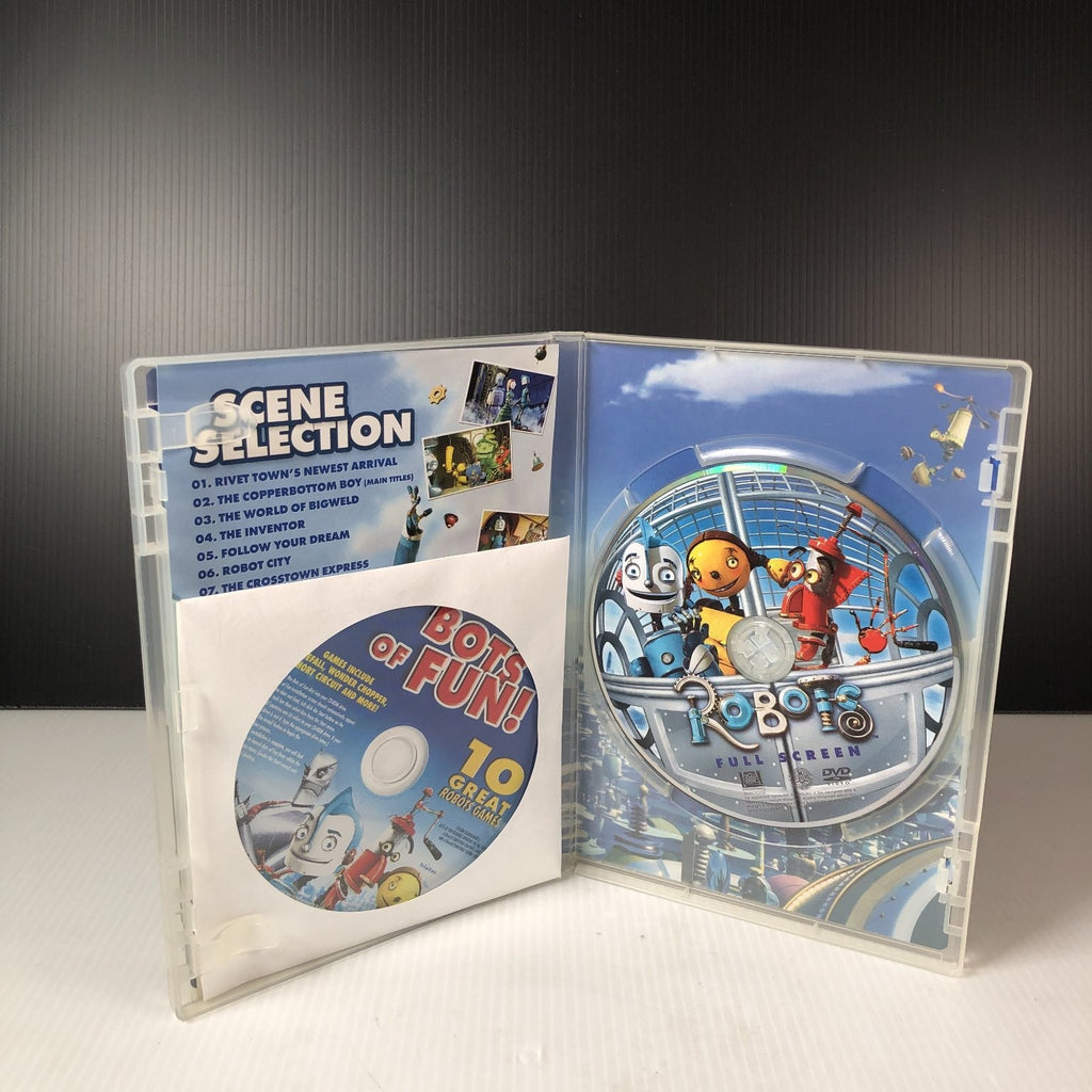 This DVD includes a variety of special features such as filmmaker audio commentary by director Chris Wedge and producer William Joyce, deleted scenes, interactive profiles, a Blue Man Group music featurette, and an all-new animated short titled "Watch Aunt Fanny's Tour of Booty." Additionally, the disc offers several interactive games and an exclusive sneak peek at Ice Age 2. The packaging includes a bonus disc with 10 robot-themed games, enhancing the entertainment experience. This Region 1 NTSC DVD is presented in English with subtitles in English, Spanish, and French, running approximately 99 minutes.