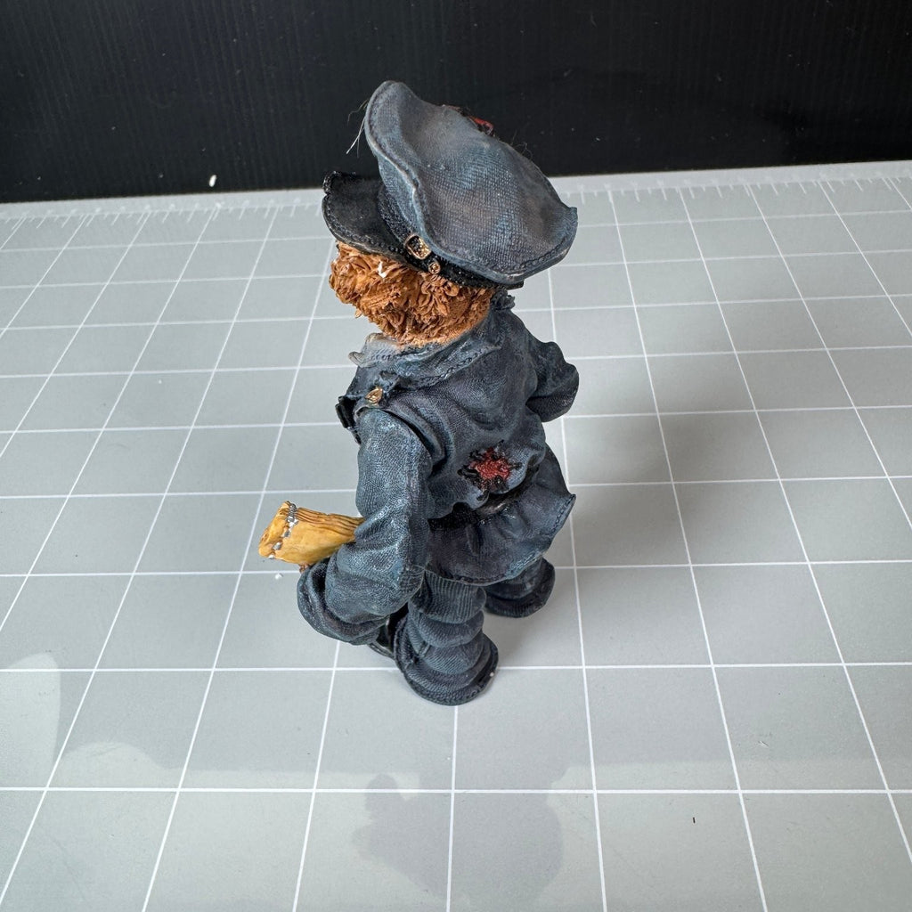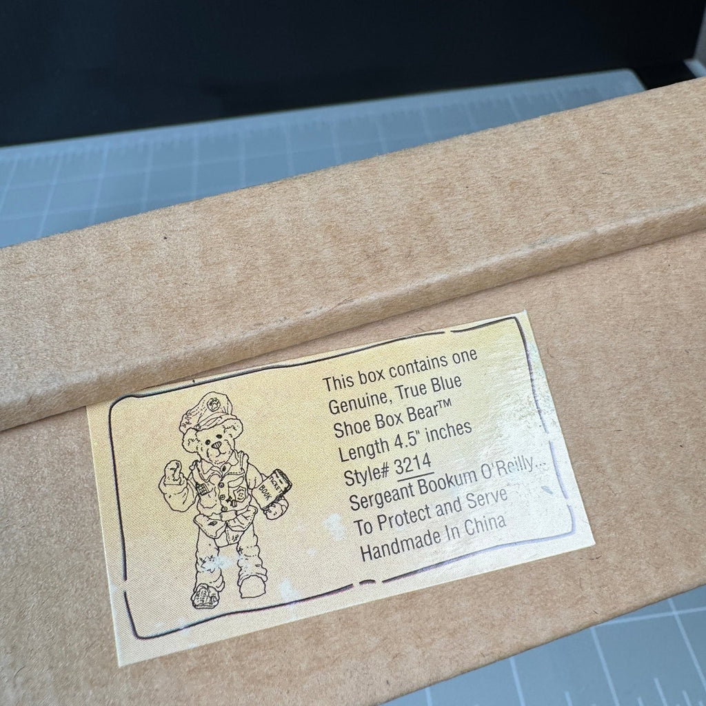 The figure is crafted with painted details highlighting the bear's textured fur and uniform patches. The bear's police hat features a paw print emblem. The box label states: "This box contains one Genuine, True Blue Shoe Box Bear Length 4.5 inches Style# 3214 Sergeant Bookum O'Reilly... To Protect and Serve Handmade in China." This vintage collectible from Boyds Bears is a charming addition for collectors of bear figurines, police-themed collectibles, or Boyds Bears memorabilia.