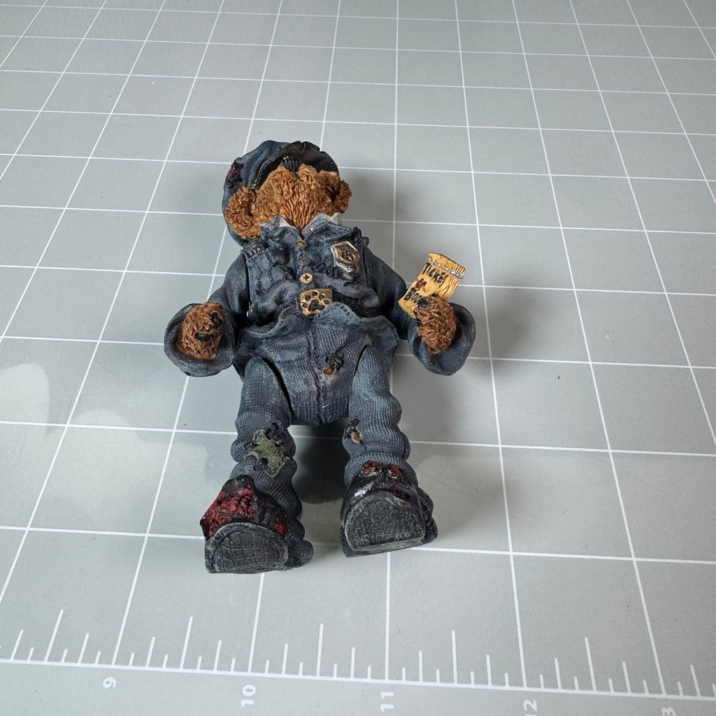 This is a Sergeant Bookum O'Reilly figure from the Boyds Bears Shoe Box Bears collection. The figure stands approximately 4.5 inches tall and depicts a bear dressed in a detailed police uniform holding a ticket book. It includes the original shoe box with an illustrated label and a small booklet titled "The Shoe Box Bears" featuring the Boyds Bears & Friends trademark. The figure is handmade in China and comes with its original packaging and paperwork. The style number is 3214, as indicated on the box and barcode label.