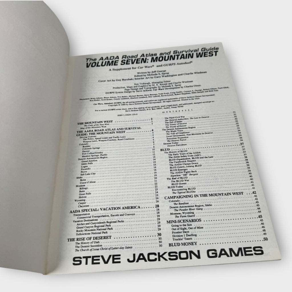 Explore the rugged landscapes and treacherous routes of the Mountain West with the SJG Car Wars AADA Road Atlas & Survival Guide Volume 7. Published in 1988 by Steve Jackson Games, this comprehensive guide is an essential tool for any road warrior seeking to navigate the dangers and delights of the region's highways and byways.