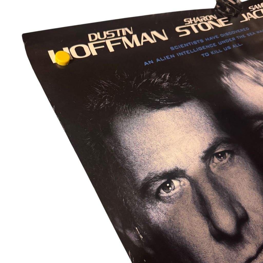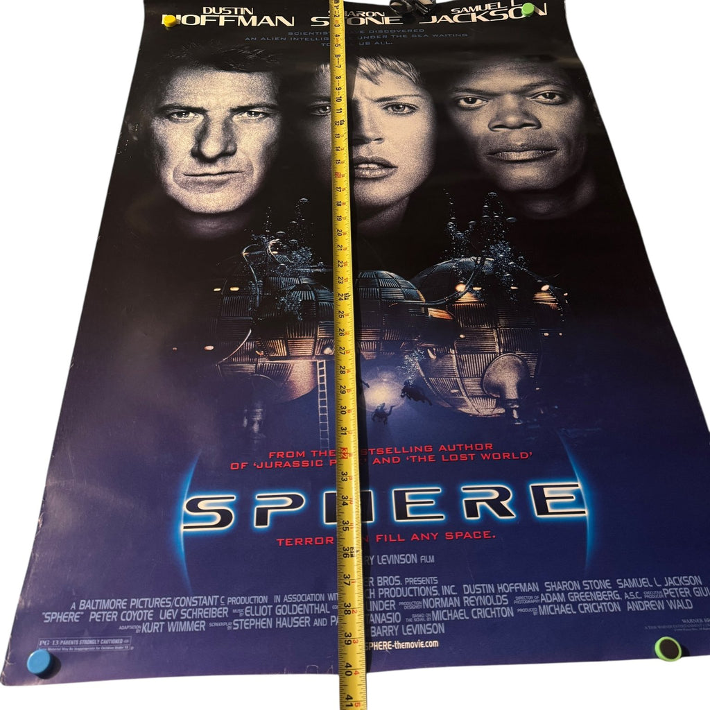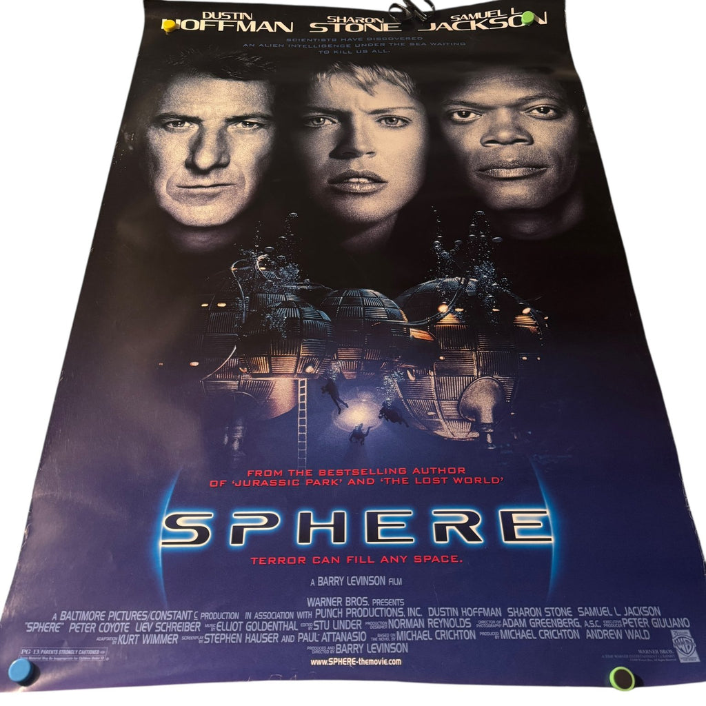 This original United States movie poster is for the 1998 sci-fi thriller film Sphere, directed by Barry Levinson. The poster prominently features the faces of the film's stars Dustin Hoffman, Sharon Stone, and Samuel L. Jackson, set against a dark blue background. Below the stars, the artwork depicts a futuristic underwater sphere structure with divers exploring, emphasizing the film's alien intelligence and underwater suspense themes. The tagline "Terror Can Fill Any Space" is displayed under the title, which is rendered in glowing white and blue letters.