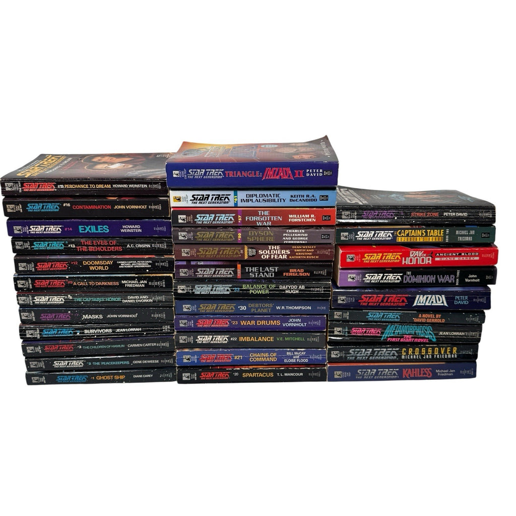 This lot includes 33 paperback books from the Star Trek: The Next Generation franchise, focusing on the science fiction genre. The books are part of the collectibles category and feature various adventures and stories within the Star Trek universe. Perfect for fans of the series, these books offer a convenient and portable format for enjoying the thrilling and imaginative worlds of Star Trek on the go.