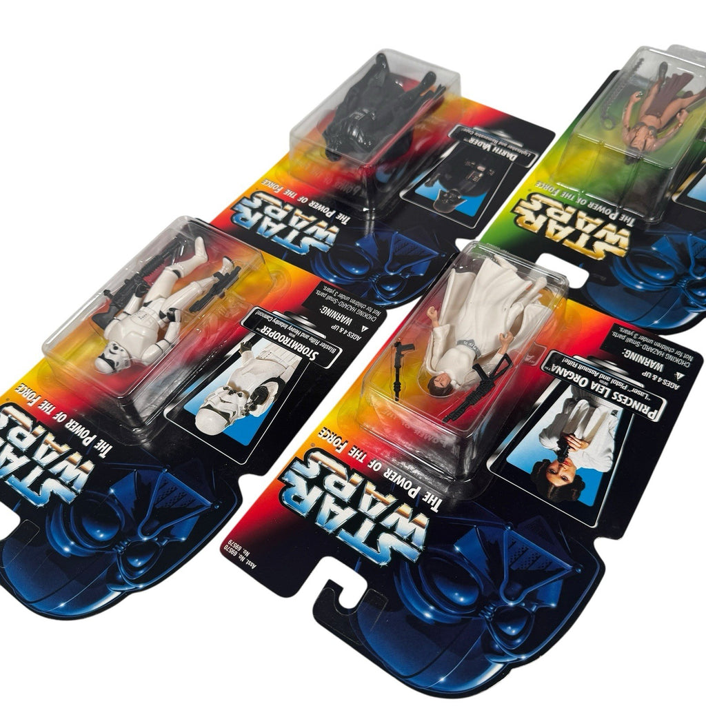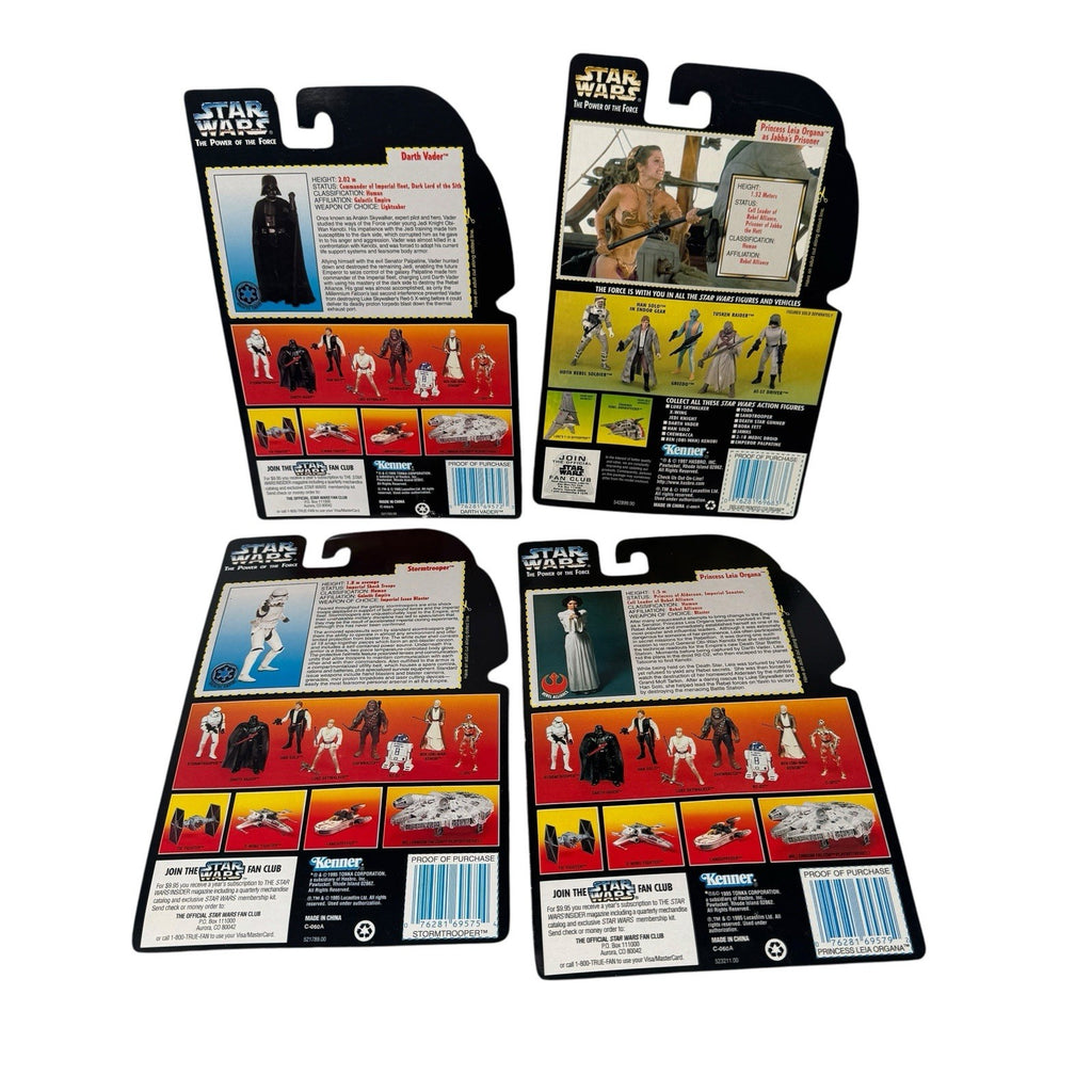 This lot of 4 Star Wars Power Of The Force action figures includes iconic characters like Darth Vader and more. Made of plastic by Kenner in the 1990s, these vintage figures are part of the Star Wars franchise and are original. Perfect for collectors or fans of the Star Wars universe, these action figures bring to life the beloved characters from the movies like Star Wars: Episode IV – A New Hope.