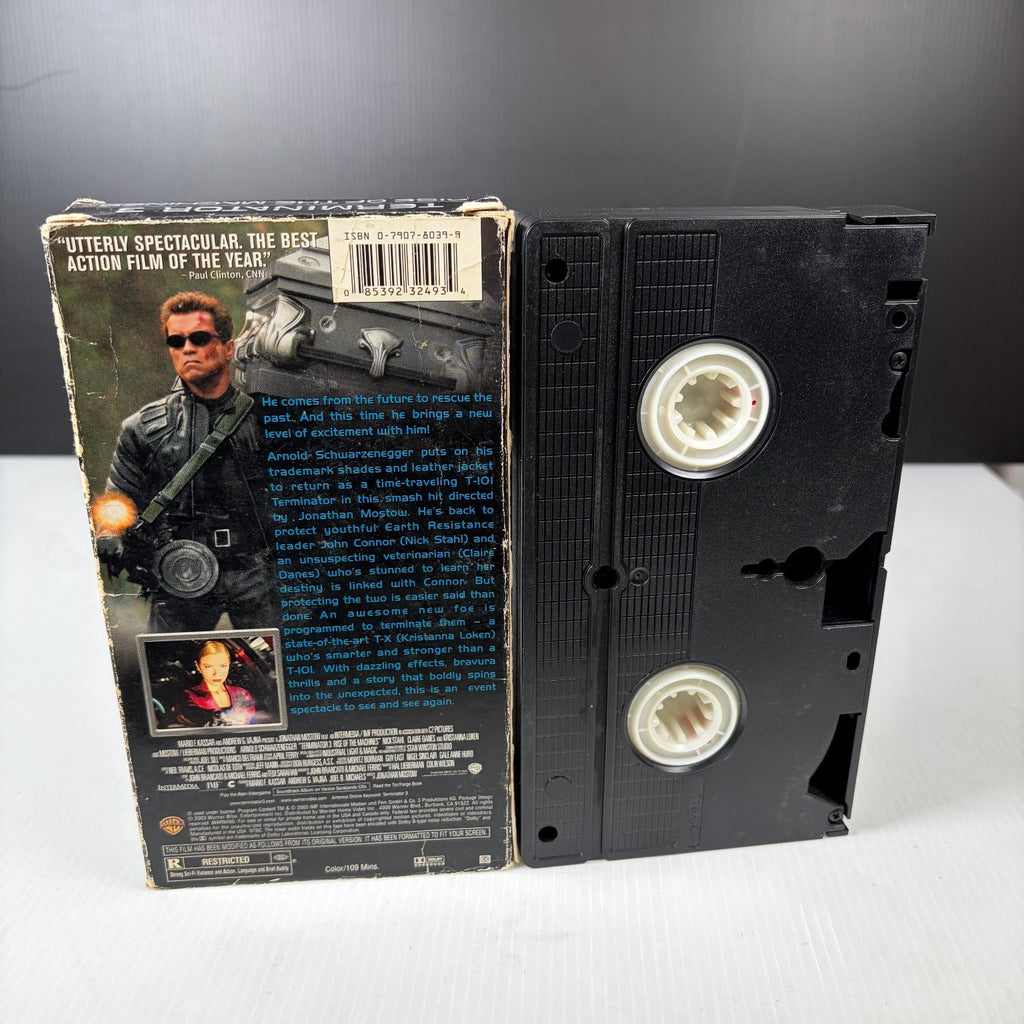 This original Warner Home Video VHS release features NTSC format and comes in its original slipcase packaging, showcasing striking cover art with Schwarzenegger's iconic Terminator image. The tape runs approximately 109 minutes and is rated R for strong sci-fi violence, language, and brief nudity. A must-have collectible for sci-fi and Terminator fans, this VHS captures the essence of early 2000s action cinema and the evolving battle between humans and machines.This product is in Very Good condition.