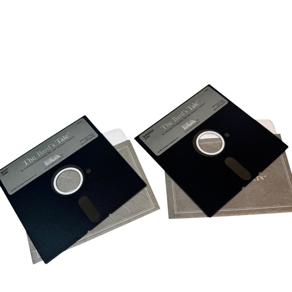 Experience the classic role-playing adventure with The Bard's Tale, developed by Interplay Productions and published by Electronic Arts in 1985. This vintage Apple II edition includes the original Boot Disk and Dungeon Disk, both essential for gameplay on Apple II, II+, //e, and //c models requiring 64K or 128K memory and blank disks for installation. Immerse yourself in a rich fantasy world where you navigate dungeons, battle monsters, and develop your party to save the city of Skara Brae.