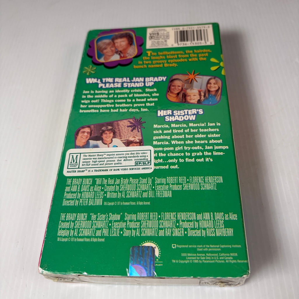Step back into the groovy world of the Bradys with this classic VHS release of "The Brady Bunch," Volume Three. This tape features two memorable episodes from the beloved 1970s television series: "Will The Real Jan Brady Please Stand Up" and "Her Sister's Shadow." Join the iconic Brady family as Jan grapples with an identity crisis, creating a humorous dilemma, while Marcia experiences the typical teenage woes of sibling rivalry. This edition captures the timeless charm and family-friendly humor that made "The Brady Bunch" a cultural phenomenon.