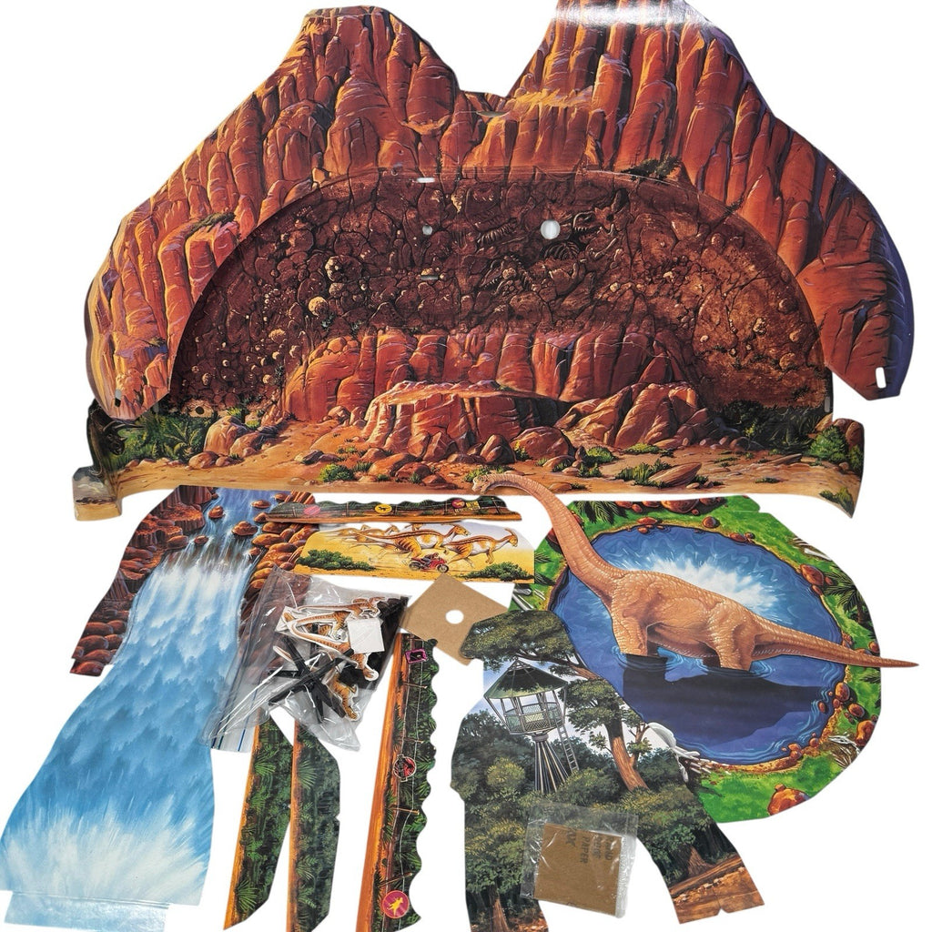 This set does not include the cars or T-Rex. It has the track, cardboard standees, controls, and power adapter. See photos for all contents and condition.