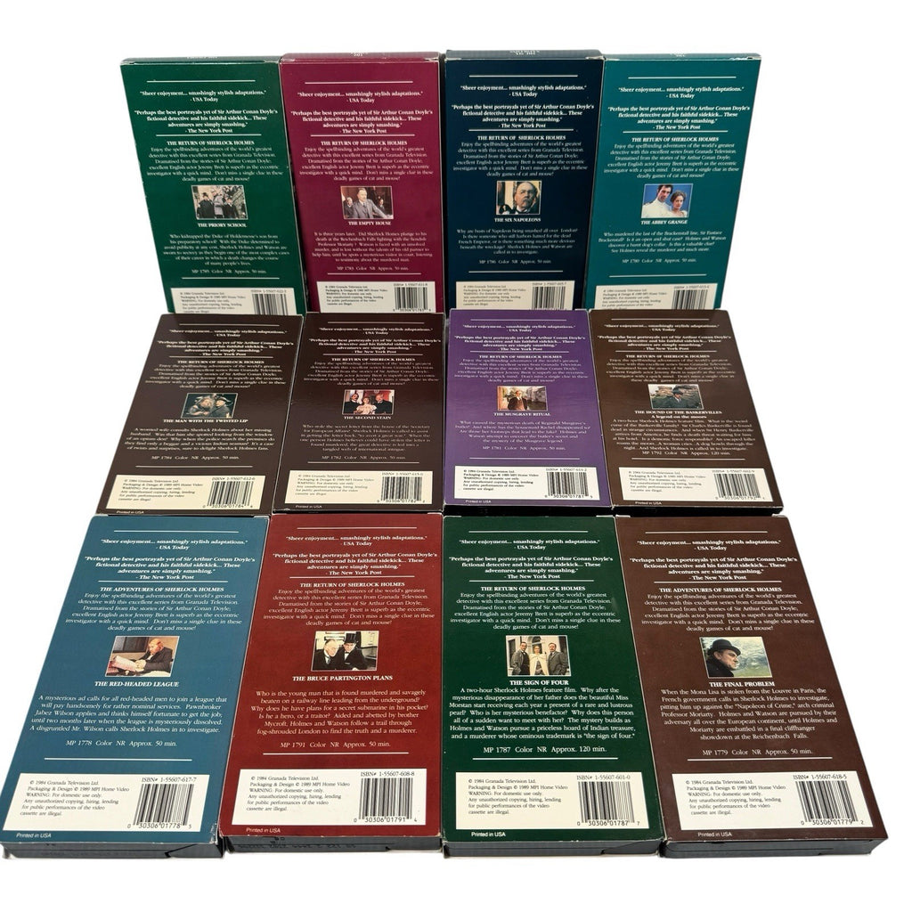 This lot of 12 VHS videotapes includes 11 tapes of "The Return of Sherlock Holmes" and 1 from “Adventures of Sherlock Holmes”. It is a collection of adventure-packed episodes within the thriller and mystery genre.