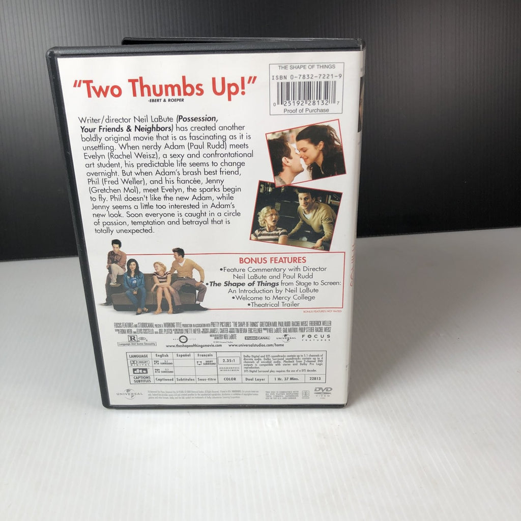This DVD edition from Focus Features includes a variety of bonus features such as a director and Paul Rudd commentary, an introduction by Neil LaBute, behind-the-scenes insights with 'The Shape of Things from Stage to Screen,' a visit to Mercy College, and the theatrical trailer. Presented in English with Dolby Digital and DTS soundtracks, this dual-layer disc offers an immersive viewing experience with a runtime of approximately 97 minutes. The packaging is a standard black DVD case with original artwork and spine labeling, making it an excellent addition for collectors and fans of intense, character-driven cinema.This product is in Very Good condition.