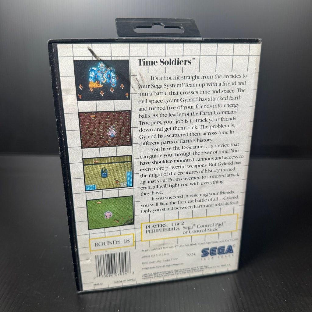 Time Soldiers for the Sega Master System is a thrilling arcade shooter that takes you on a time-traveling adventure to save your friends from the evil space tyrant Gylend. As a leader of the Earth Command Troopers, you must battle through different eras of history, from prehistoric times with dinosaurs to futuristic battlefields, using powerful shoulder-mounted cannons and the unique D-Scanner device to navigate through time.