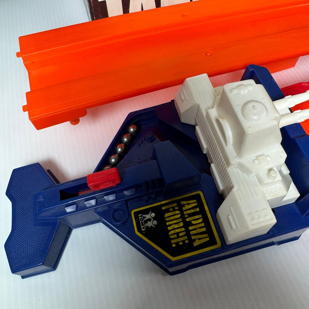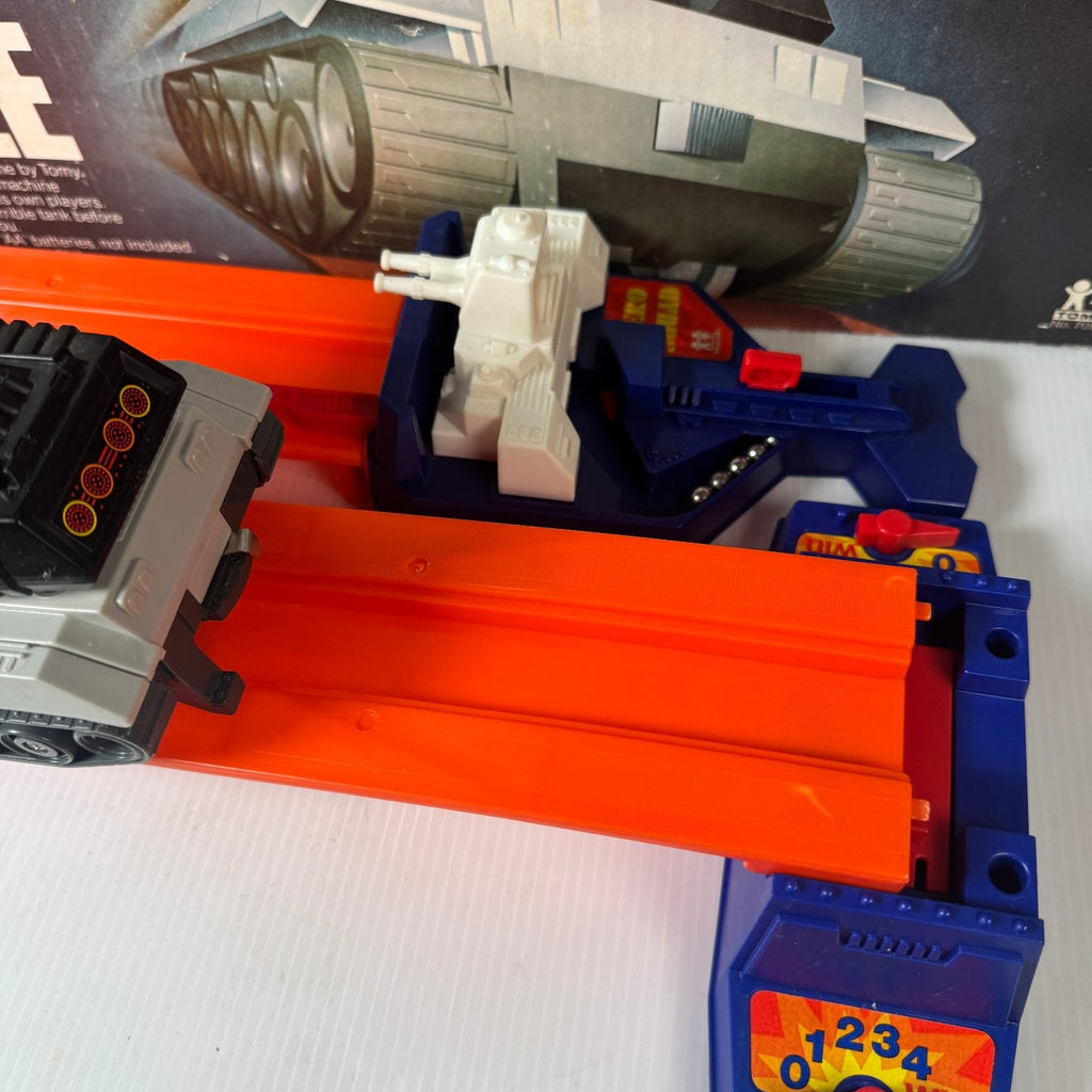 The set includes a distinctive gray and black tank with bold red and yellow lettering, two white anti-tank gun stations, and bright orange plastic track lanes with blue supports. The compact layout measures approximately 41" by 6½" and is designed for ages 6 and up. The original box shows detailed artwork and photos of children enjoying the game, adding to its collectible appeal. Ideal for vintage game collectors or fans of nostalgic mechanical games, this Tomy classic offers a fun and interactive play experience.This product is in Used condition.