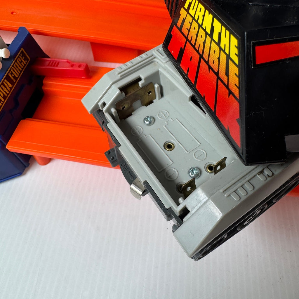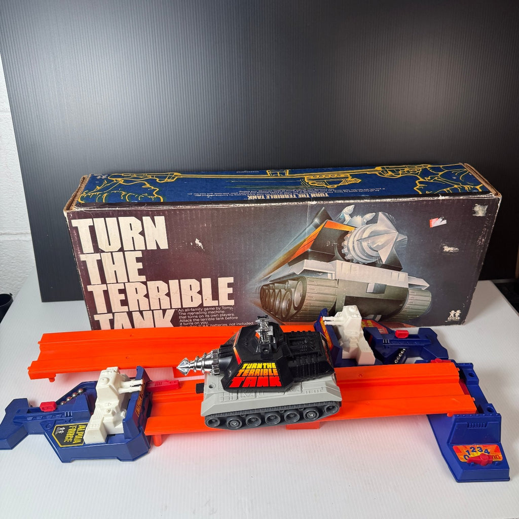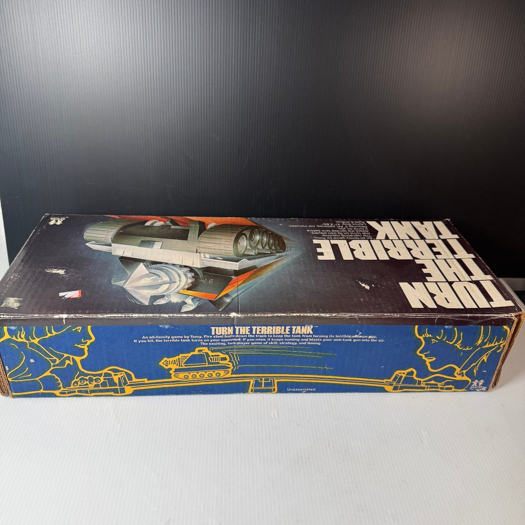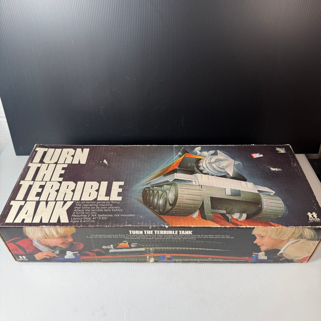 Experience vintage excitement with the Turn The Terrible Tank board game by Tomy, a classic two-player strategy game from 1979. This unique game features a motorized tank equipped with a rotating drill nose that turns toward players as they attempt to shoot steel balls down the track to keep the tank from hitting them. The game requires 2 AA batteries (not included) and combines skill, timing, and strategy in an engaging family challenge.