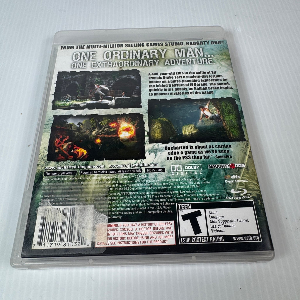 This standard edition includes the game disc and original manual, both featuring detailed artwork and branding. Compatible with NTSC-U/C systems, the game supports 720p HDTV resolution and requires minimal hard disk space. Rated Teen by ESRB for blood, language, mild suggestive themes, use of tobacco, and violence, Uncharted offers a gripping single-player campaign that has set a benchmark for PS3 adventure titles.