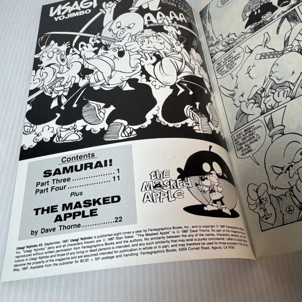 The product is a vintage single issue comic book, Usagi Yojimbo #2, published by Fantagraphics Books in September 1987. The comic features characters like Miyamoto Usagi and Katsuichi, written by Dave Thorne and Stan Sakai. The cover artwork was done by Tom Luth and Stan Sakai. This collectible comic belongs to the Copper Age of US Comics, with a genre that includes elements of martial arts, adventure, funny animal, and historical themes.