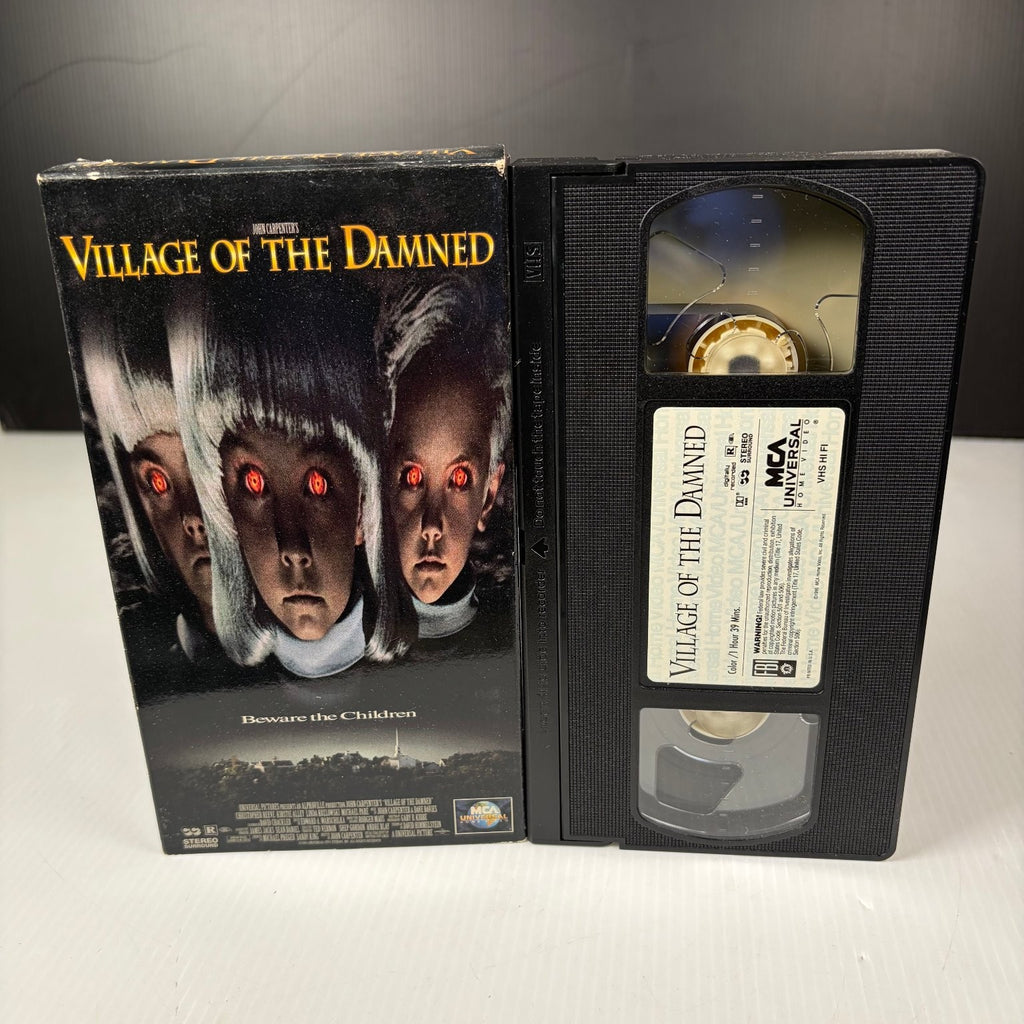 Starring a stellar cast including Christopher Reeve as Dr. Alan Chaffee, Kirstie Alley as Susan Verner, and Mark Hamill, this film is a must-have for collectors of 90s horror, sci-fi thrillers, and John Carpenter's acclaimed filmography. Experience the suspense and dread as the town grapples with these enigmatic, powerful children. This VHS release captures the film's eerie atmosphere and suspenseful narrative, making it a compelling addition to any vintage movie collection.This product is in Very Good condition.