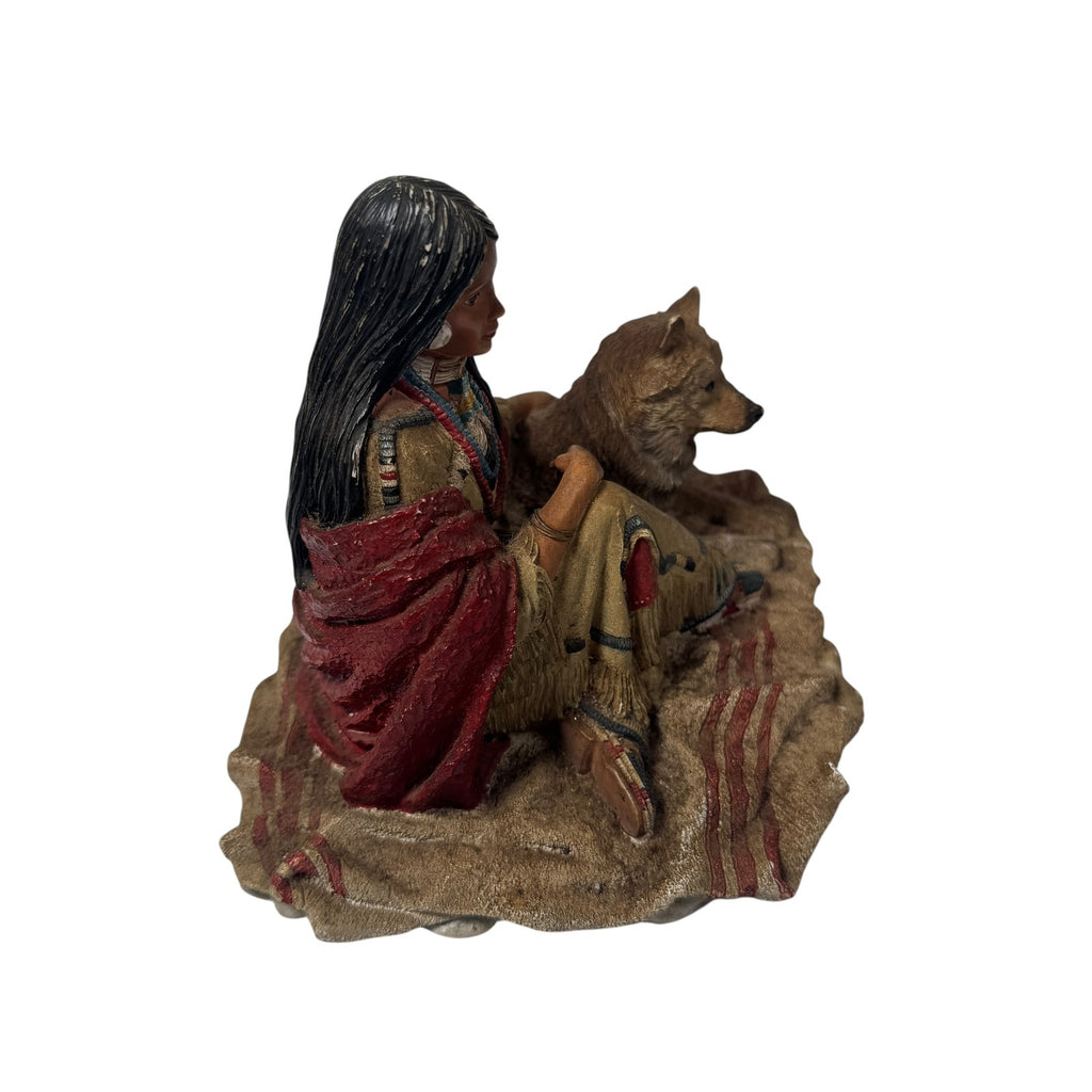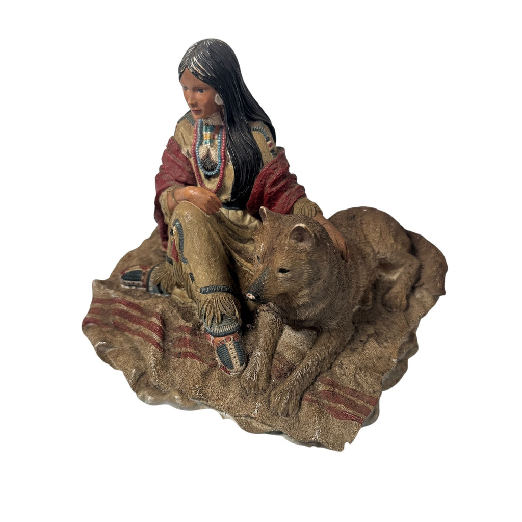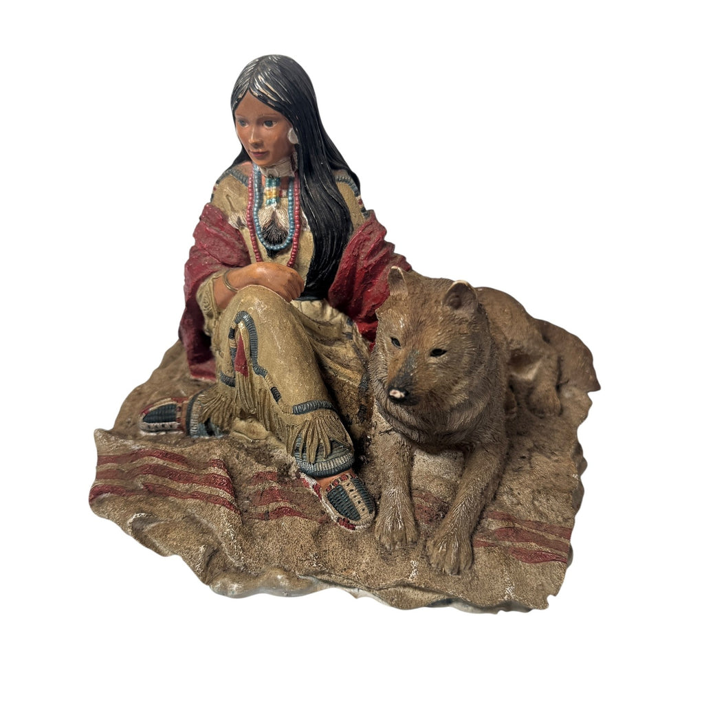 Hand-painted sculpture depicts a Native American woman with long black hair, traditional dress, beadwork jewelry, and red shawl seated beside a wolf on a textured patterned blanket.