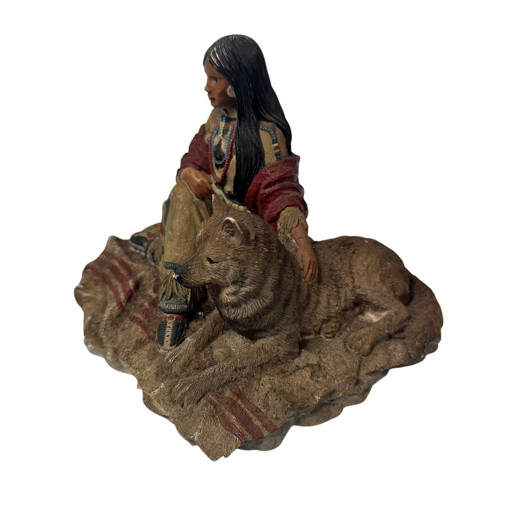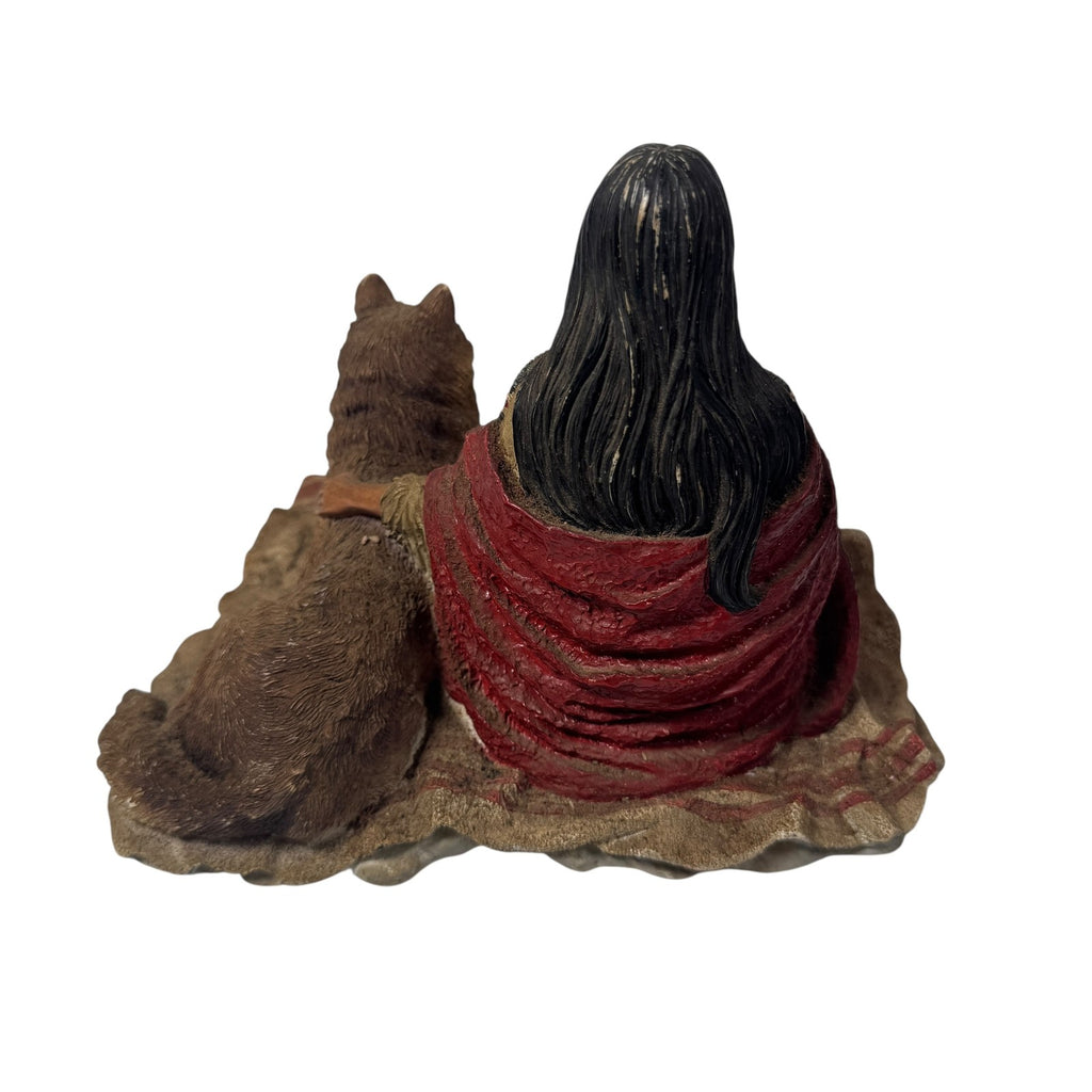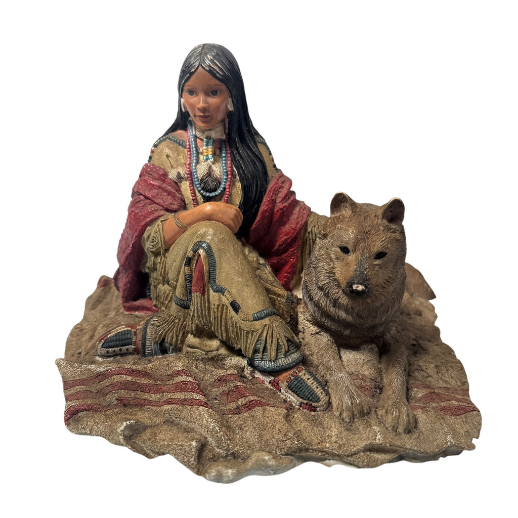 Hand-painted sculpture depicts a Native American woman with long black hair, traditional dress, beadwork jewelry, and red shawl seated beside a wolf on a textured patterned blanket.