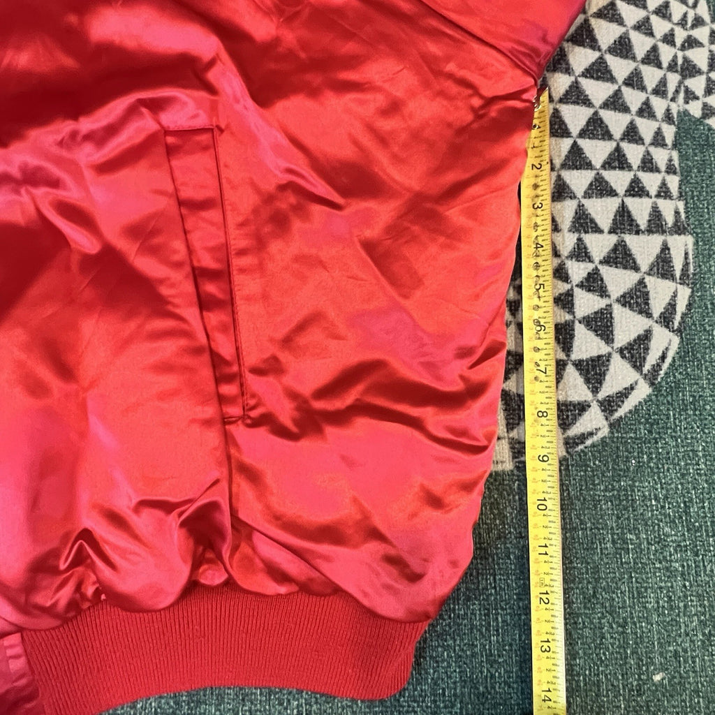 This Vintage 1996 Mirage & Golden Nugget Reversible Bomber Jacket is a classic outerwear piece perfect for casual occasions. Made from acetate with polyester insulation, this multicolor jacket features a satin fabric type with embroidered accents and logos. The reversible design adds versatility to the piece, while the zip and button closure ensures a secure fit. With a chest size of 29” and a 3XL size, this Flight brand jacket from the United States offers a timeless style with a band collar and bomber jacket design.