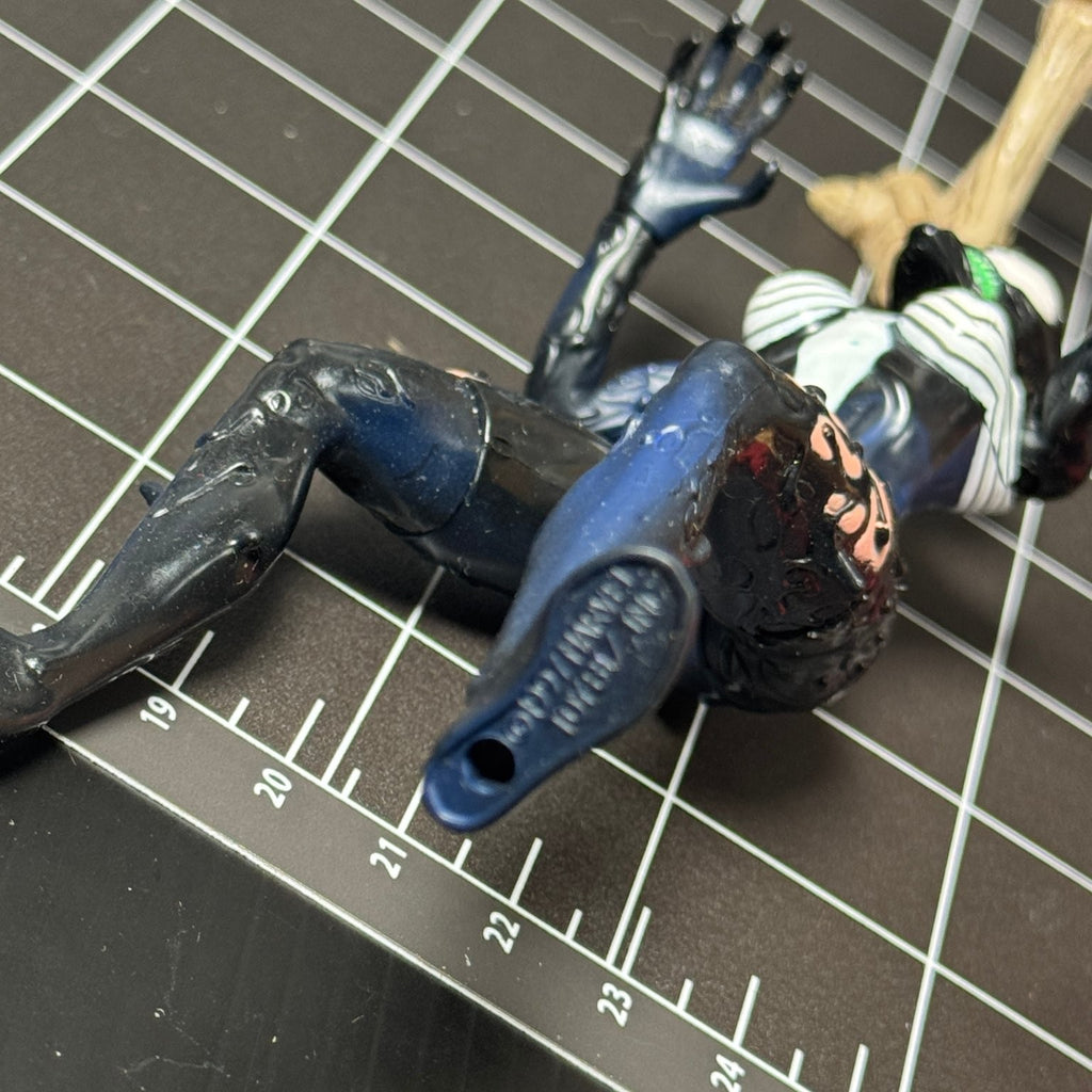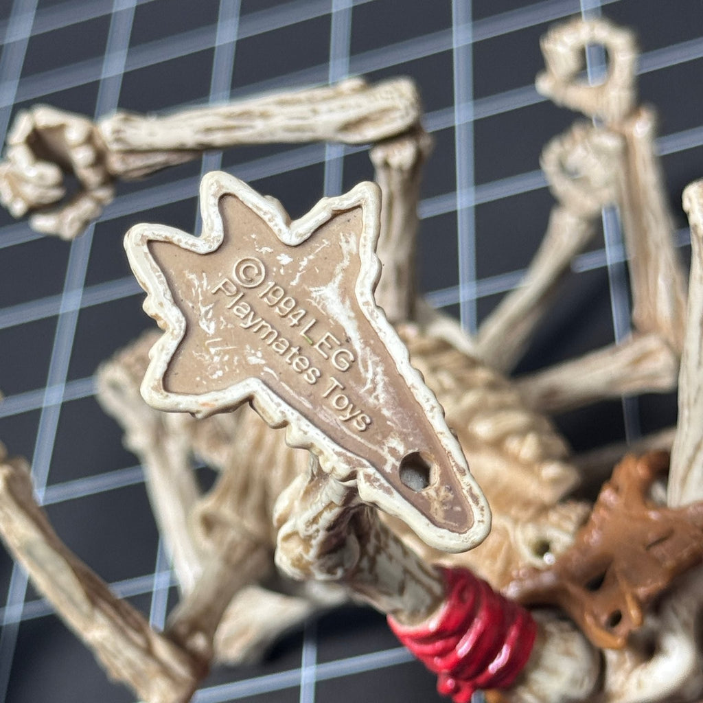 This vintage collection features iconic 1990s action figures from popular franchises. Included are highly detailed figures of Spider-Man and Venom, each crafted from durable plastic with multiple articulation points for dynamic posing. The six-armed skeleton figure is marked ©1994 Playmates Toys, showcasing intricate sculpting and paintwork, perfect for collectors of classic Marvel characters.