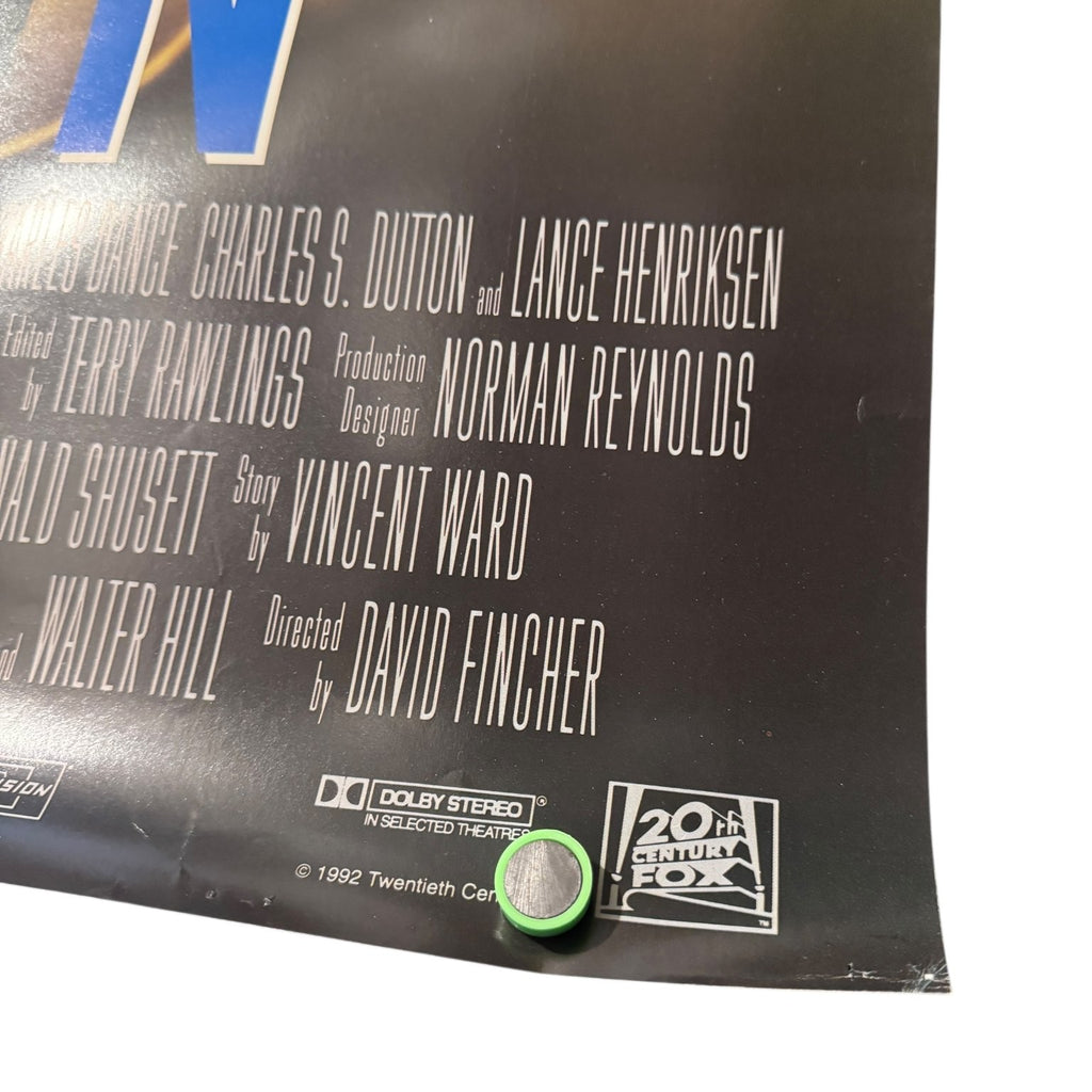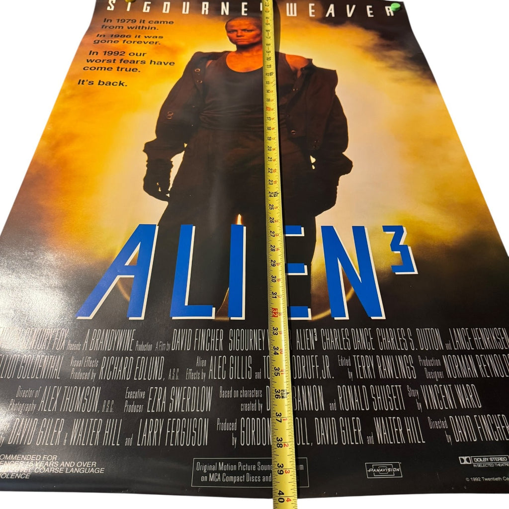 Exact specifications visible on the poster include the film title Alien³, year 1992, country United States, item type one sheet movie poster, starring Sigourney Weaver, Charles Dance, Charles S. Dutton, Lance Henriksen, directed by David Fincher, printed by 20th Century Fox, and substrate paper. The poster also displays the © 1992 Twentieth Century Fox mark along with formal credit lines for the production team and cast. This is a classic collectible for fans of sci-fi horror and the Alien series.This product is in Used condition.
