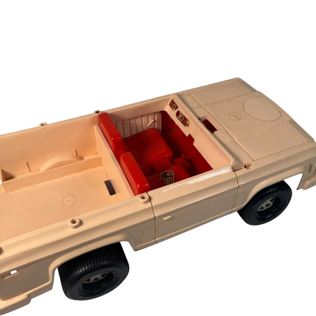 Classic Barbie playset from the 1970s era featuring a beige plastic convertible camper truck with red interior and matching detachable horse trailer