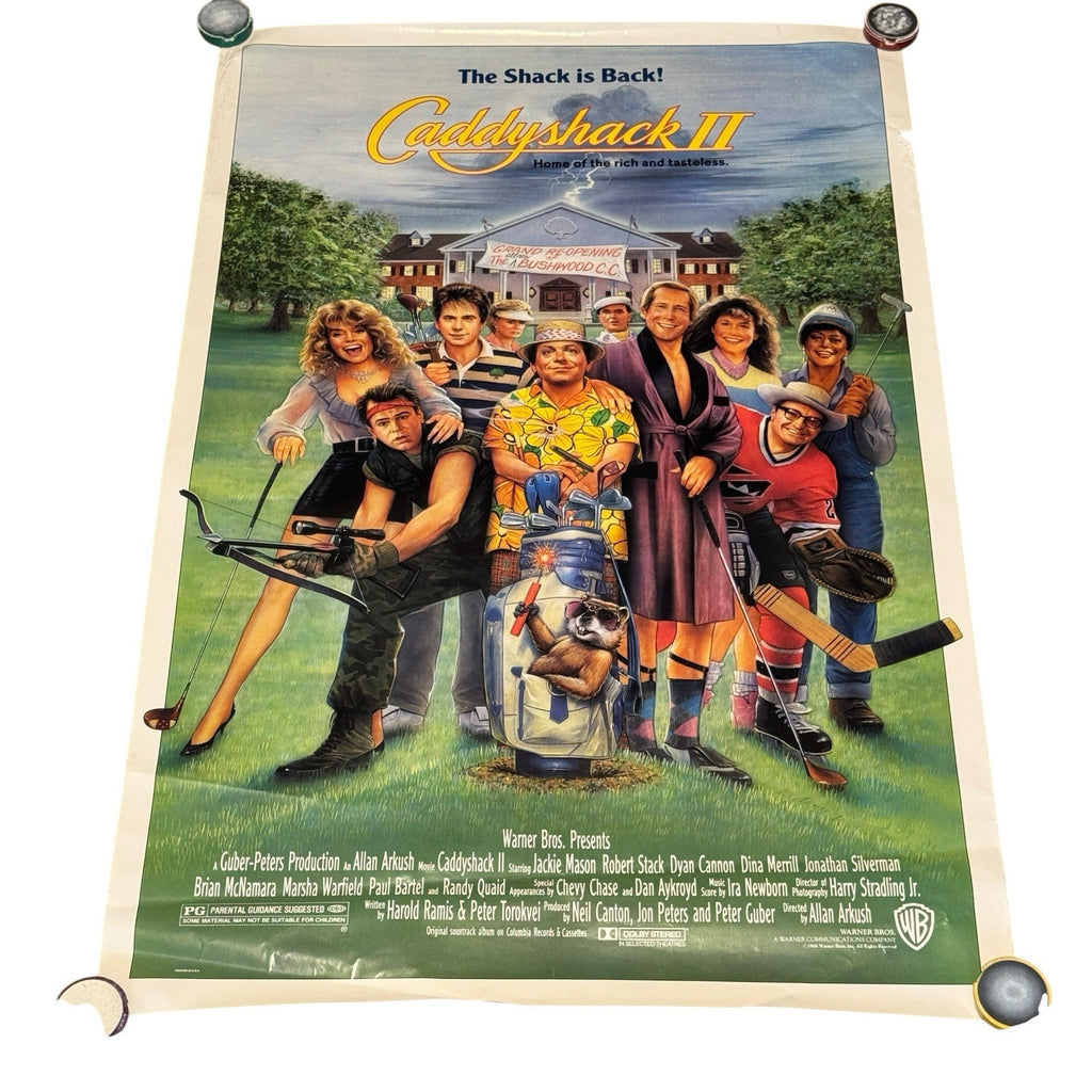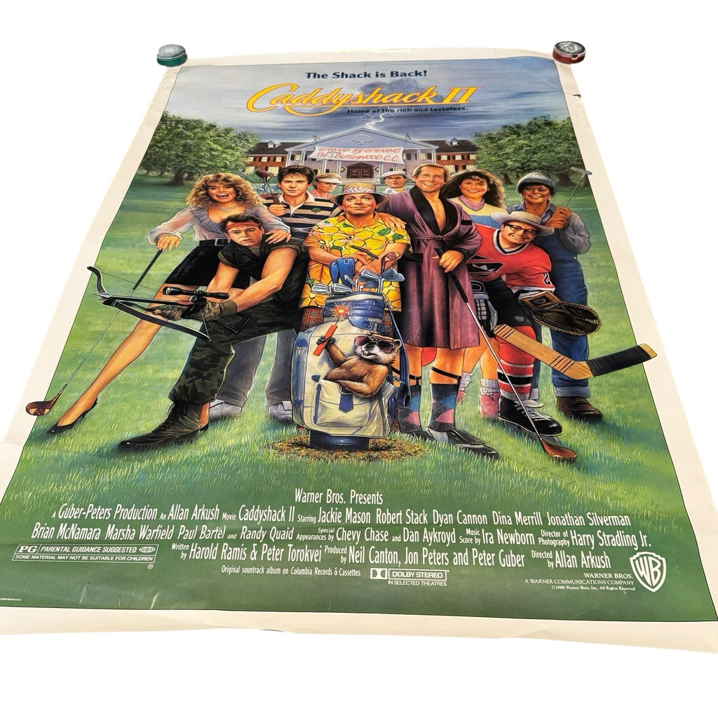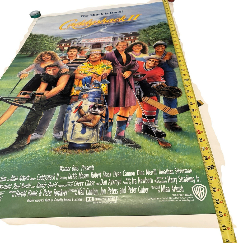 This is a vintage original one sheet movie poster for Caddyshack II from 1988. This poster measures 40 inches in height and 27 inches in width, making it a substantial piece of entertainment memorabilia. It is a genuine original print from the United States, showcasing the iconic imagery and design from the classic movie. Perfect for fans of Caddyshack II or movie memorabilia collectors, this poster captures a nostalgic moment in cinema history.