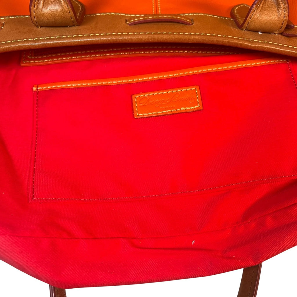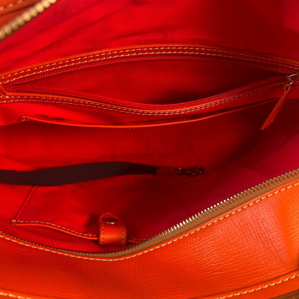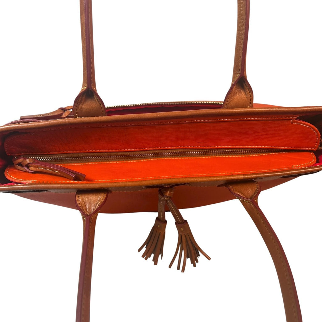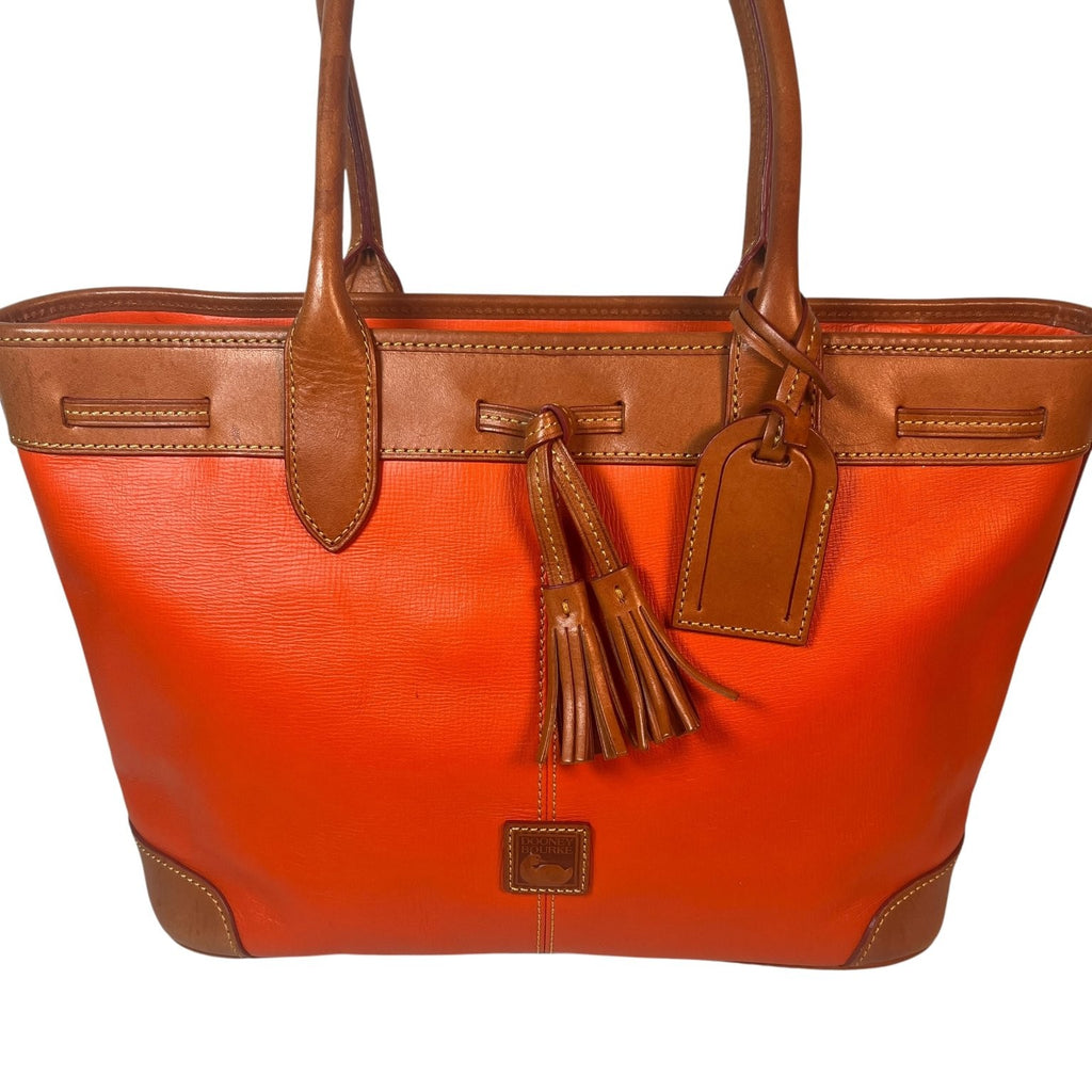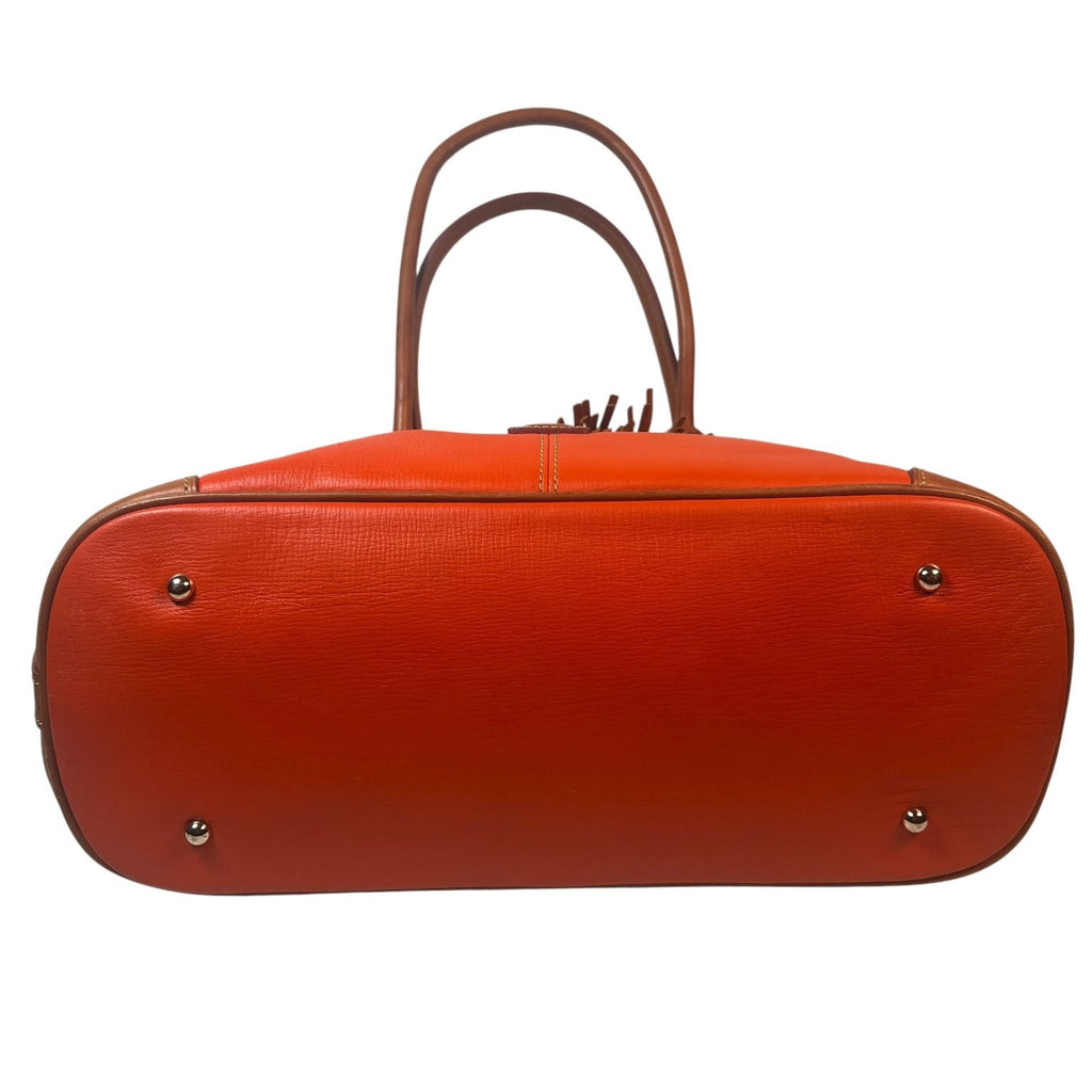 Elevate your style with this vibrant Dooney & Bourke women's tote bag, featuring a bold orange exterior contrasted with rich brown leather trim. Crafted from high-quality leather and durable materials, this spacious tote is perfect for everyday use or special occasions. The design includes signature tassel accents and a branded leather patch, adding a touch of sophistication and brand recognition.