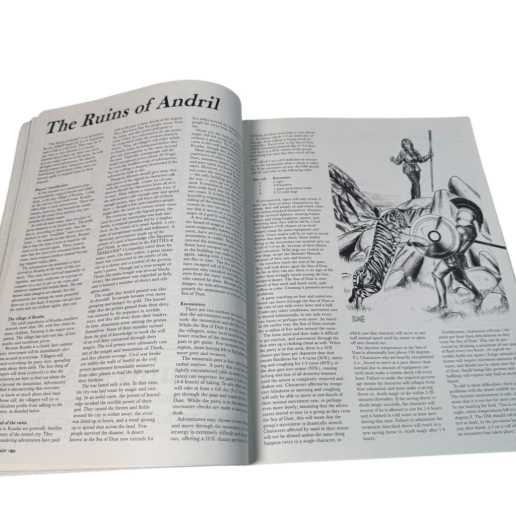 This issue features the high-level AD&D adventure "The Ruins of Andril," along with additional content for advanced Dungeons & Dragons, including articles on playing with poison and material spell components.