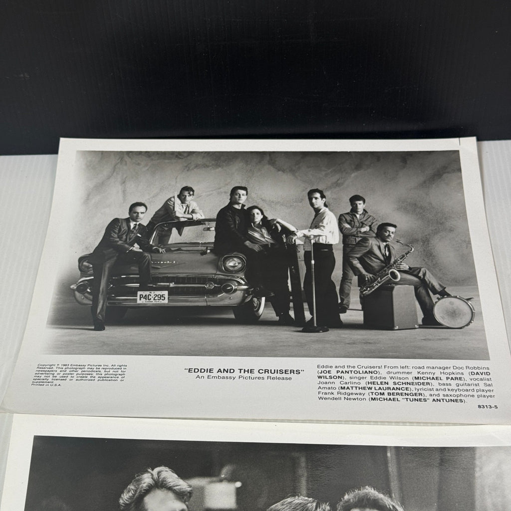 This is a set of 8x10 vintage promo movie stills from the film "Eddie and the Cruisers" featuring Michael Pare and John Cafferty. These original black and white photographs showcase iconic scenes from the movie, capturing the essence of the 80s rock musical genre. Made in the United States, these memorabilia pieces offer a glimpse into the nostalgia of the era, perfect for fans of the film or collectors of vintage movie artifacts.This product is in condition.