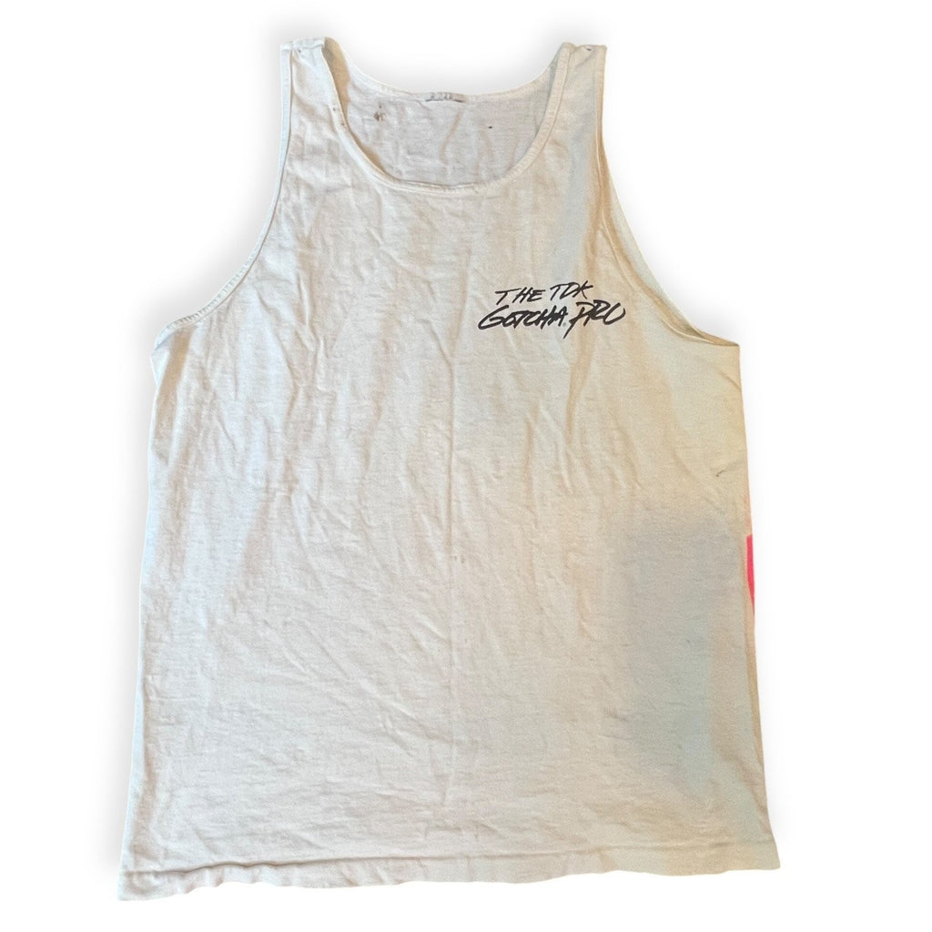 This vintage Gotcha Pro tank top from the late 1980s is a true collector's piece and a standout example of surf culture apparel. Featuring bold, colorful graphics, the front of the shirt displays a small black "The TDK Gotcha Pro" logo on the upper left chest. The back showcases a large vibrant pink surfboard print with accompanying teal and black text reading "The TDK Gotcha Pro Surf Challenge Sandy Beach Hawaii Summer '88," alongside sponsor logos such as TDK and Steinlager.