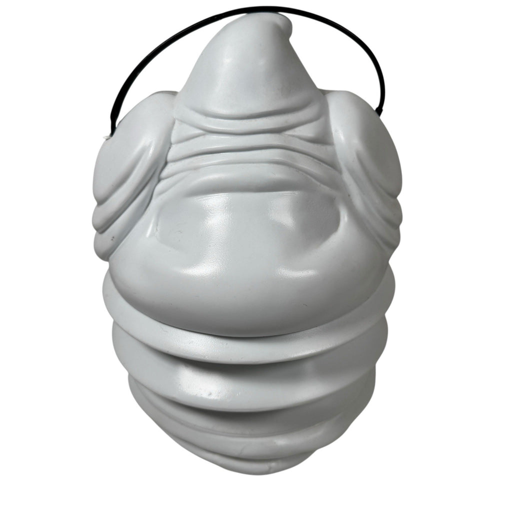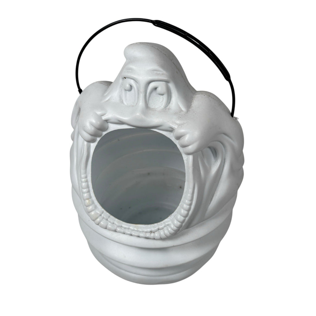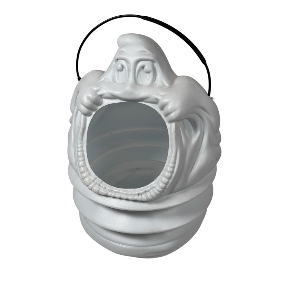This Vintage Halloween Frite N Up Pig Out Ghost Blow Mold Candy Bucket is a nostalgic piece from the 90s, perfect for Halloween collectors. Made of white plastic, this ghost-themed candy bucket is a fun addition to any Halloween decor. With its cute design and retro charm, this item appeals to both kids and adults who appreciate classic Halloween memorabilia from the 1990s.