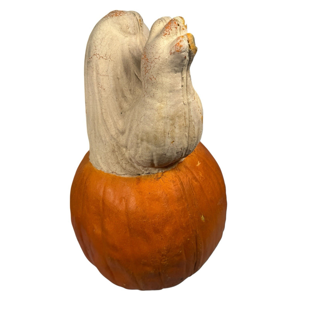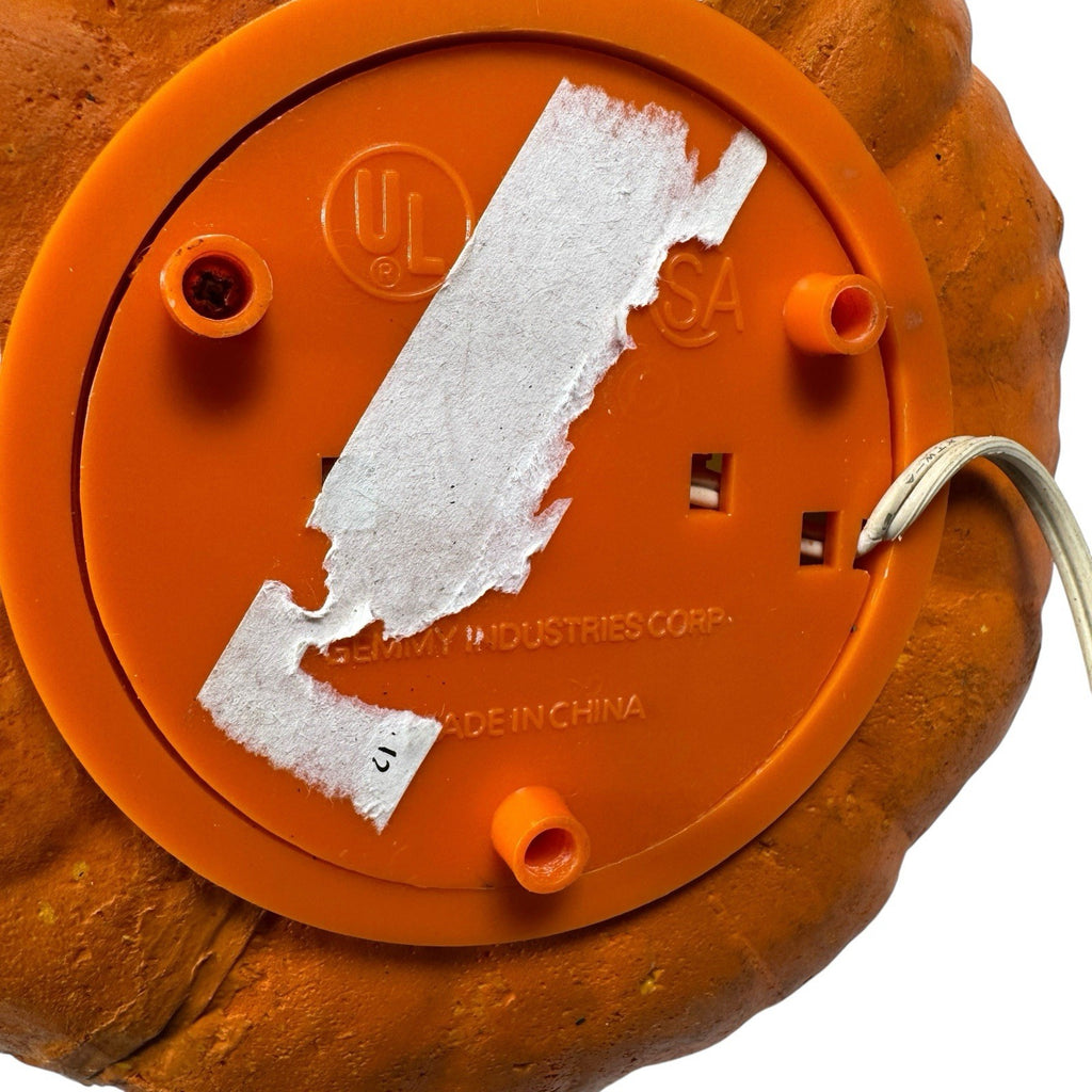 This foam type blow mold of a ghost with pumpkin had a kitschy vintage appeal. It has a modern 90s or later Gemmy light installed, but the blow mold looks significantly older. See photos for condition details. We could not find a matching blow mold.