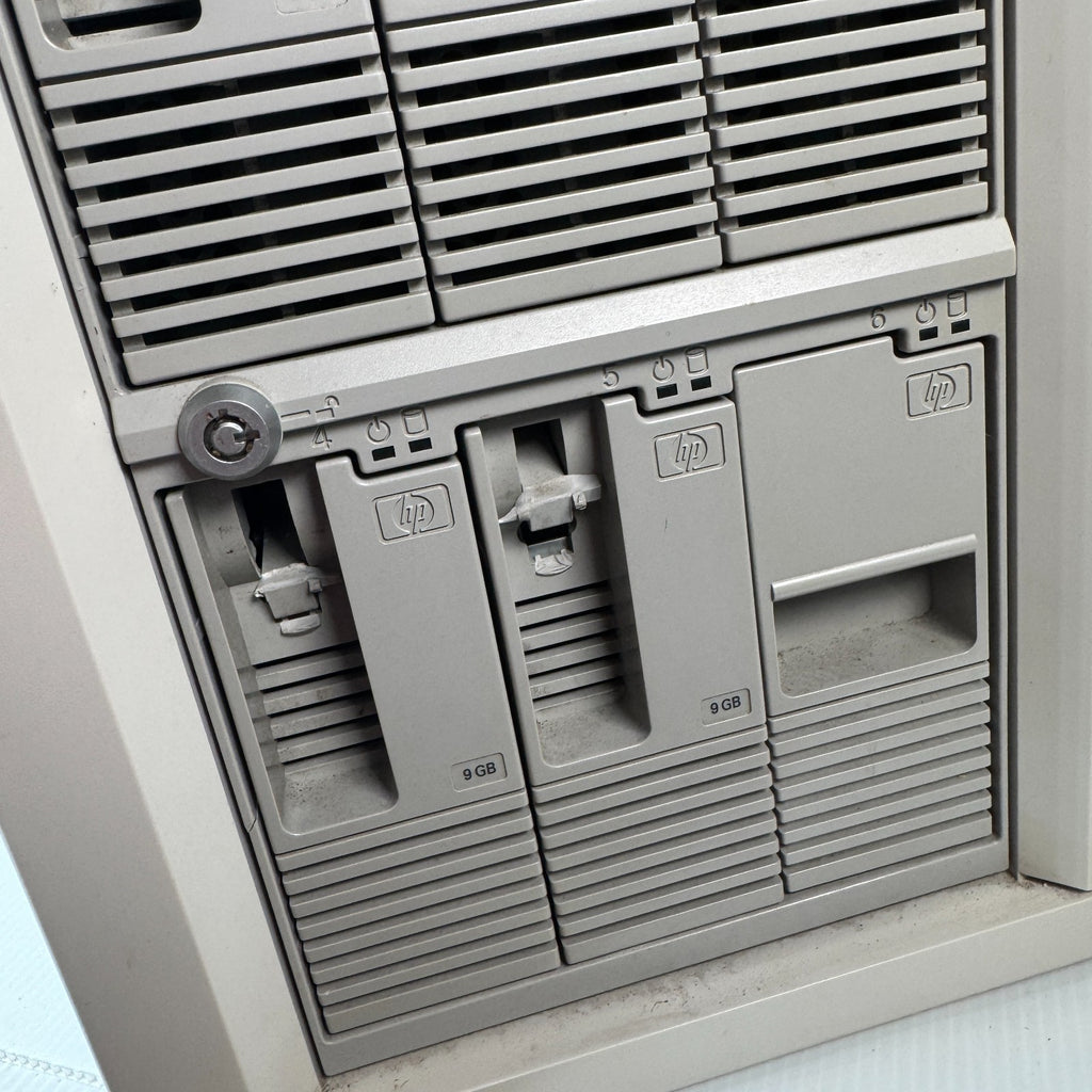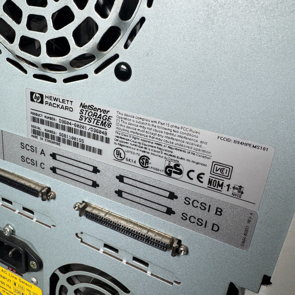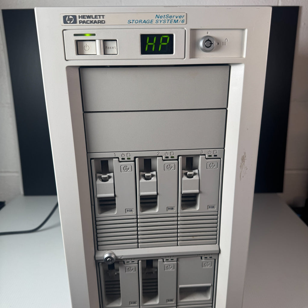 The Vintage Hewlett Packard HP NetServer Storage System includes 5 units with 9GB hard drives, offering a total storage capacity of 45GB. Made by Hewlett Packard HP in Singapore, this server is a classic piece of vintage computing history. Perfect for collectors or enthusiasts looking to experience the nostalgia of early server technology, this unit provides a glimpse into the past of server storage systems.