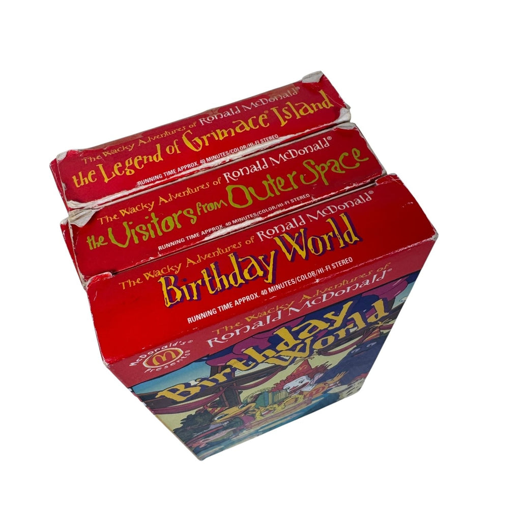 This VHS set features three classic episodes from The Wacky Adventures of Ronald McDonald series: The Legend of Grimace Island, The Visitors from Outer Space, and Birthday World. Originally released in 1998, these animated adventures showcase Ronald McDonald and his friends in fun, imaginative stories filled with colorful characters and catchy songs. Each episode runs approximately 40 minutes and is presented in color with Hi-Fi stereo sound.