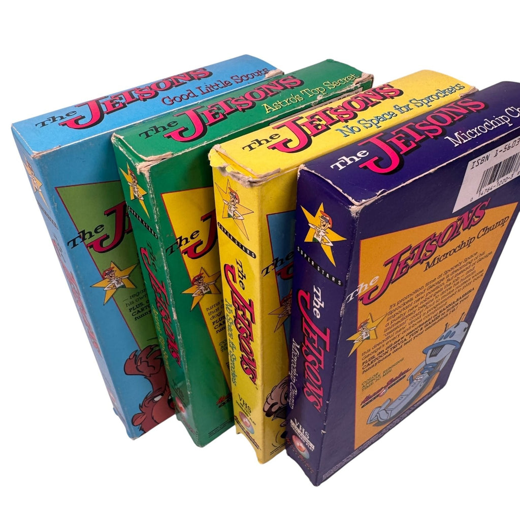 This set includes four classic VHS tapes from the beloved Hanna-Barbera Super Stars series featuring The Jetsons: "Good Little Scouts," "Astro's Top Secret," "No Space for Sprockets," and "Microchip Chump." Each tape contains original episodes from the iconic futuristic family cartoon known for its imaginative take on space-age life and humorous social satire. The stories follow George Jetson, his family, and their robotic dog Astro as they navigate adventures in a high-tech world filled with quirky inventions and lovable characters.